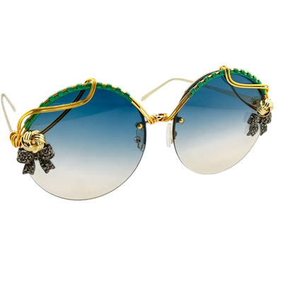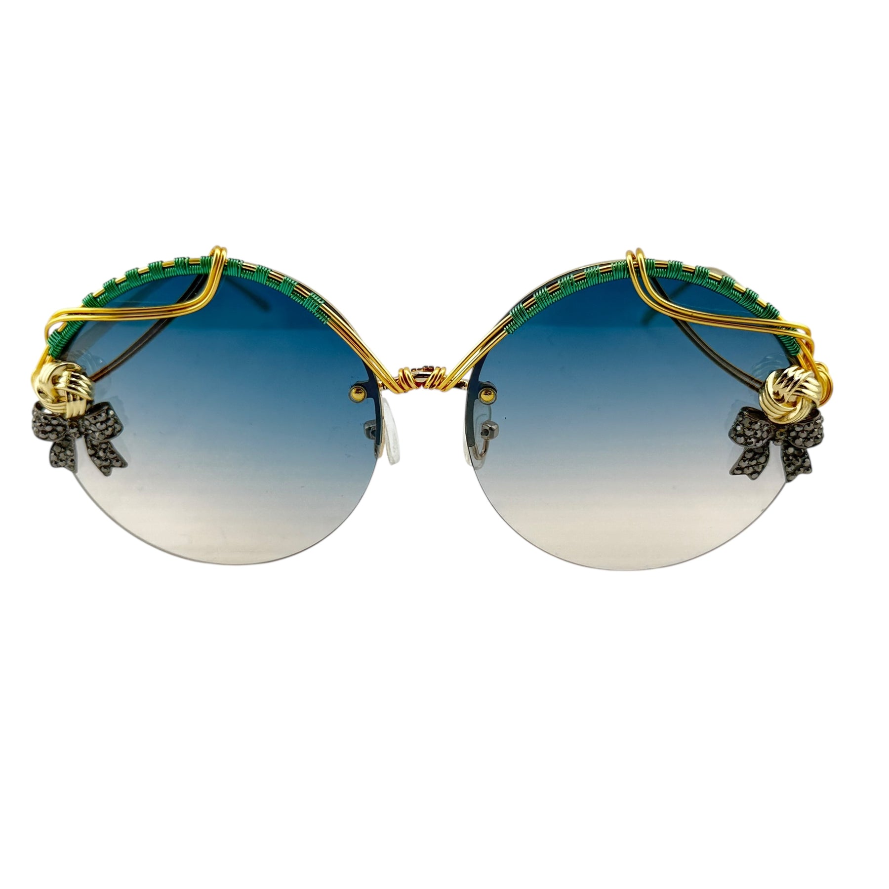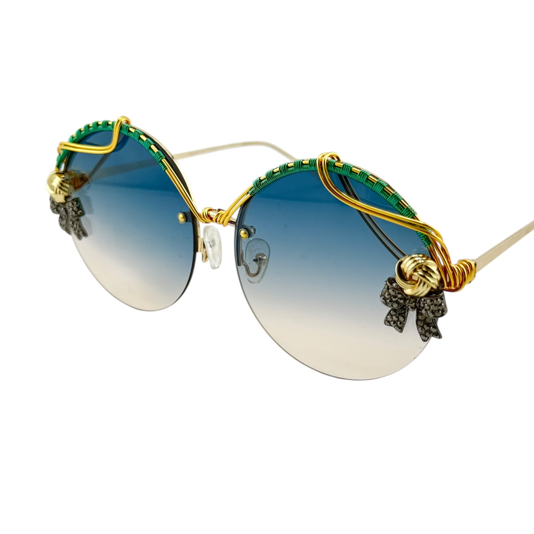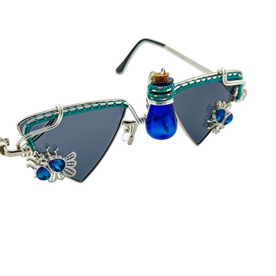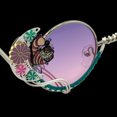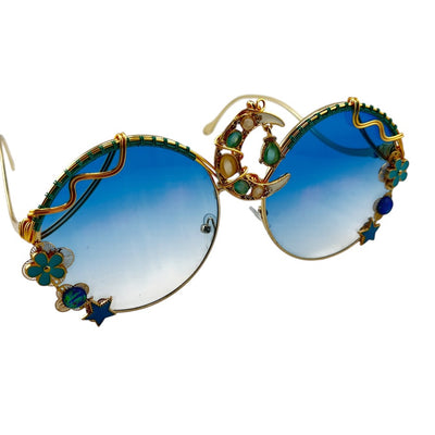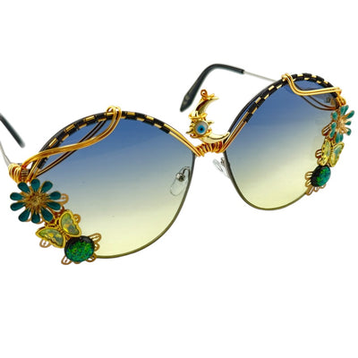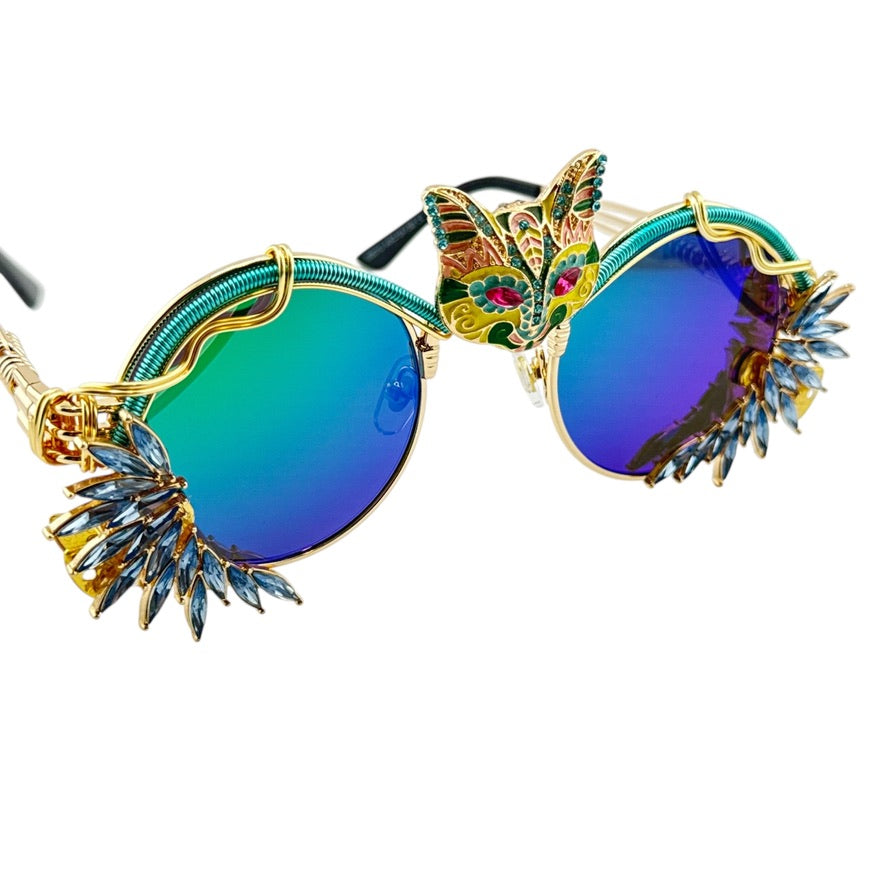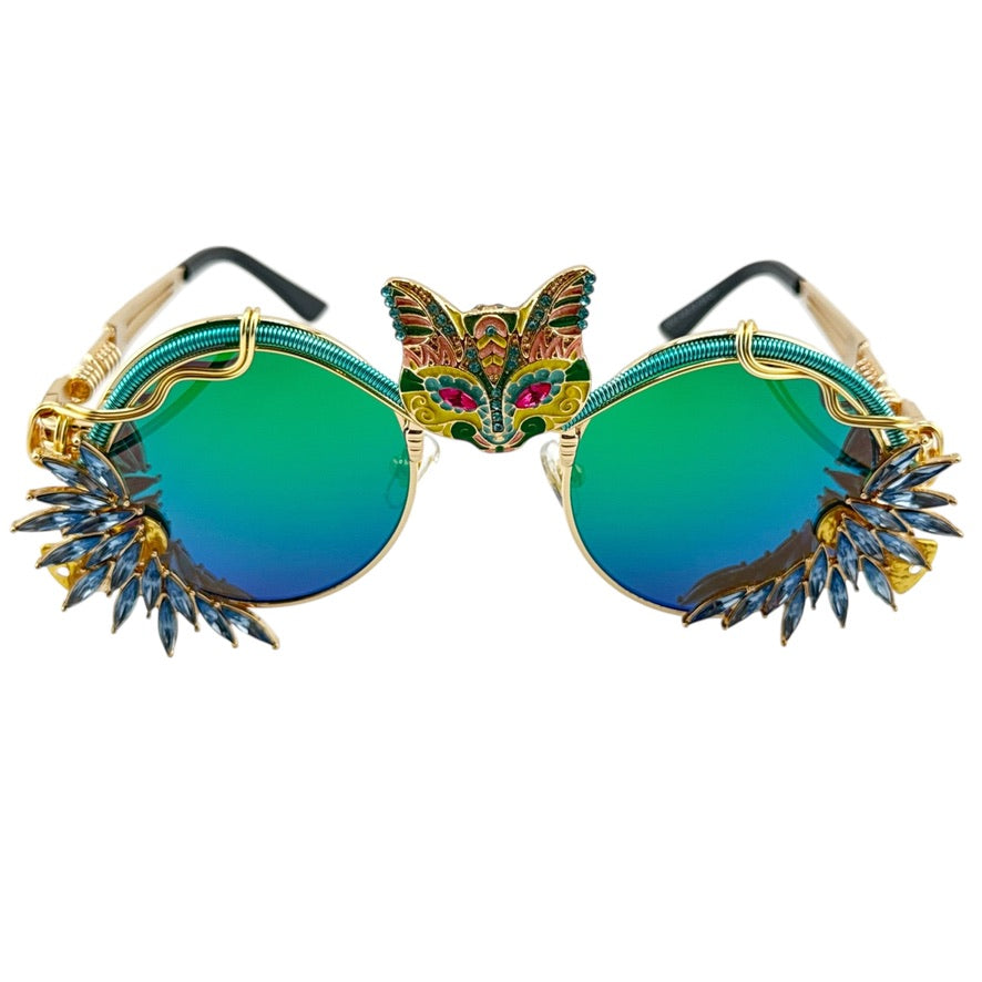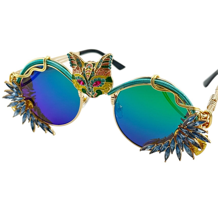This one-of-a-kind design features a jeweled enamel cat centerpiece wrapped in shimmering teal and gold wirework, paired with blue–green color-shift lenses that glow from every angle. Each side is finished with dramatic crystal starburst clusters, creating a fully dimensional, light-catching effect.