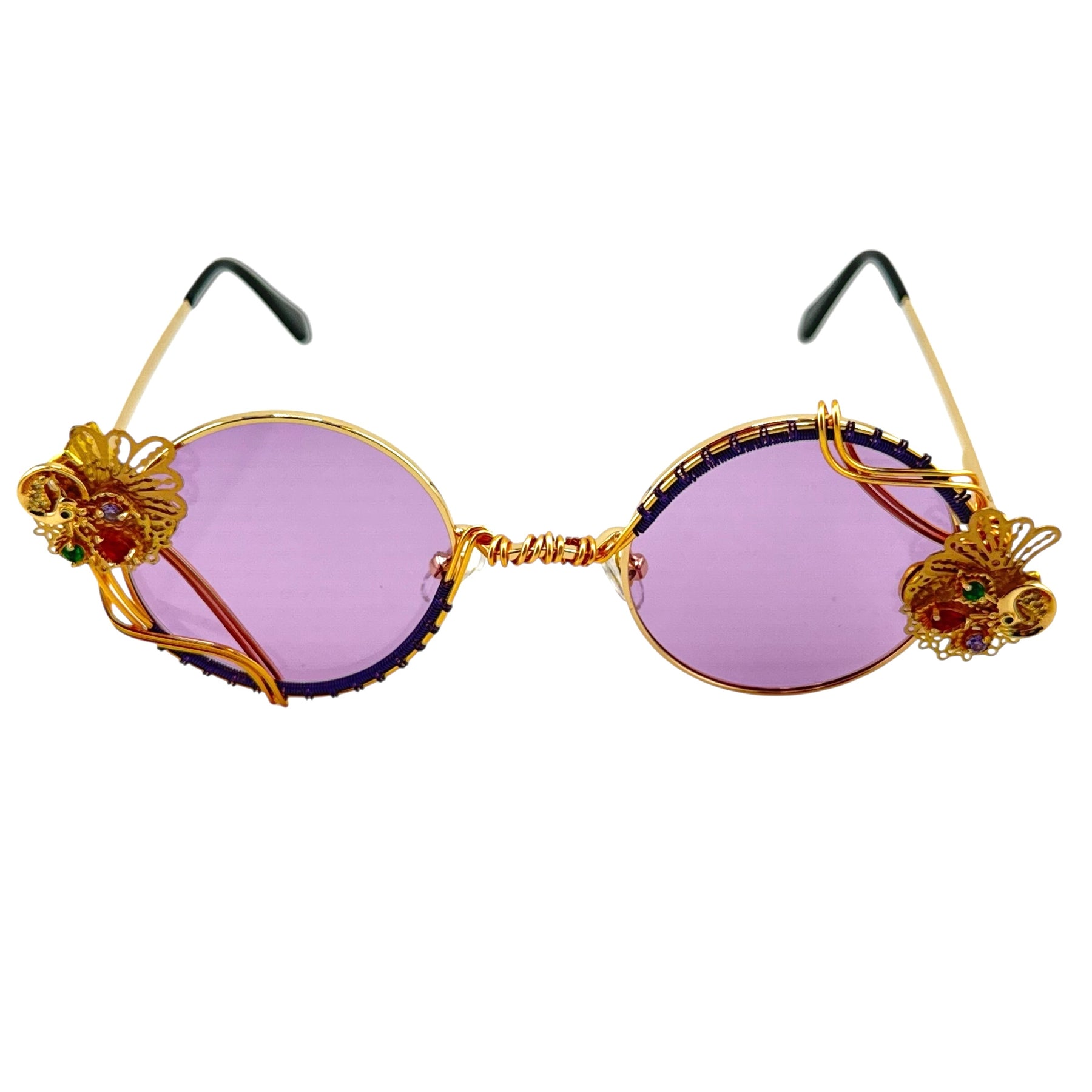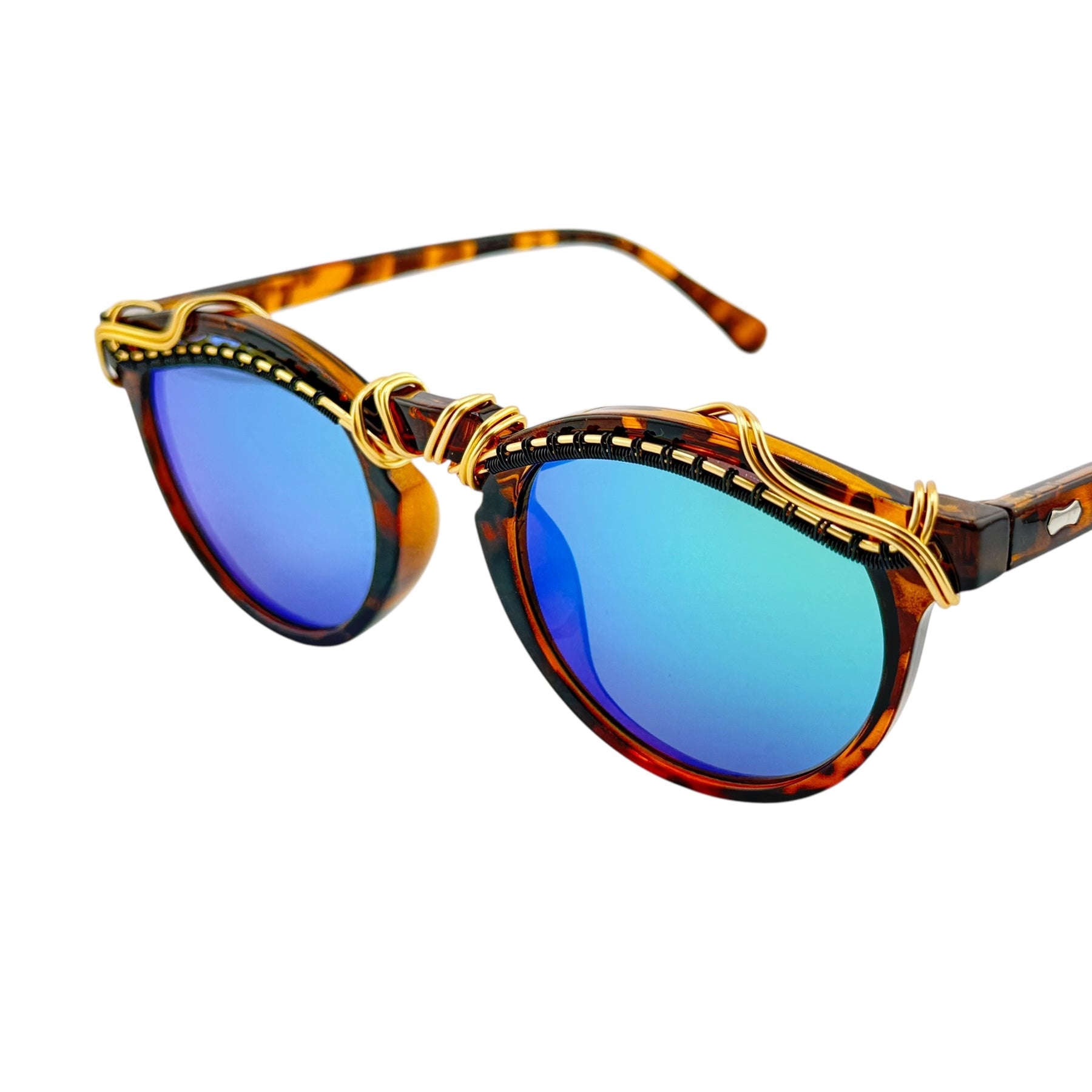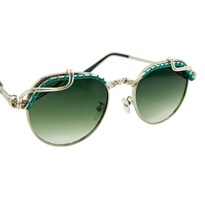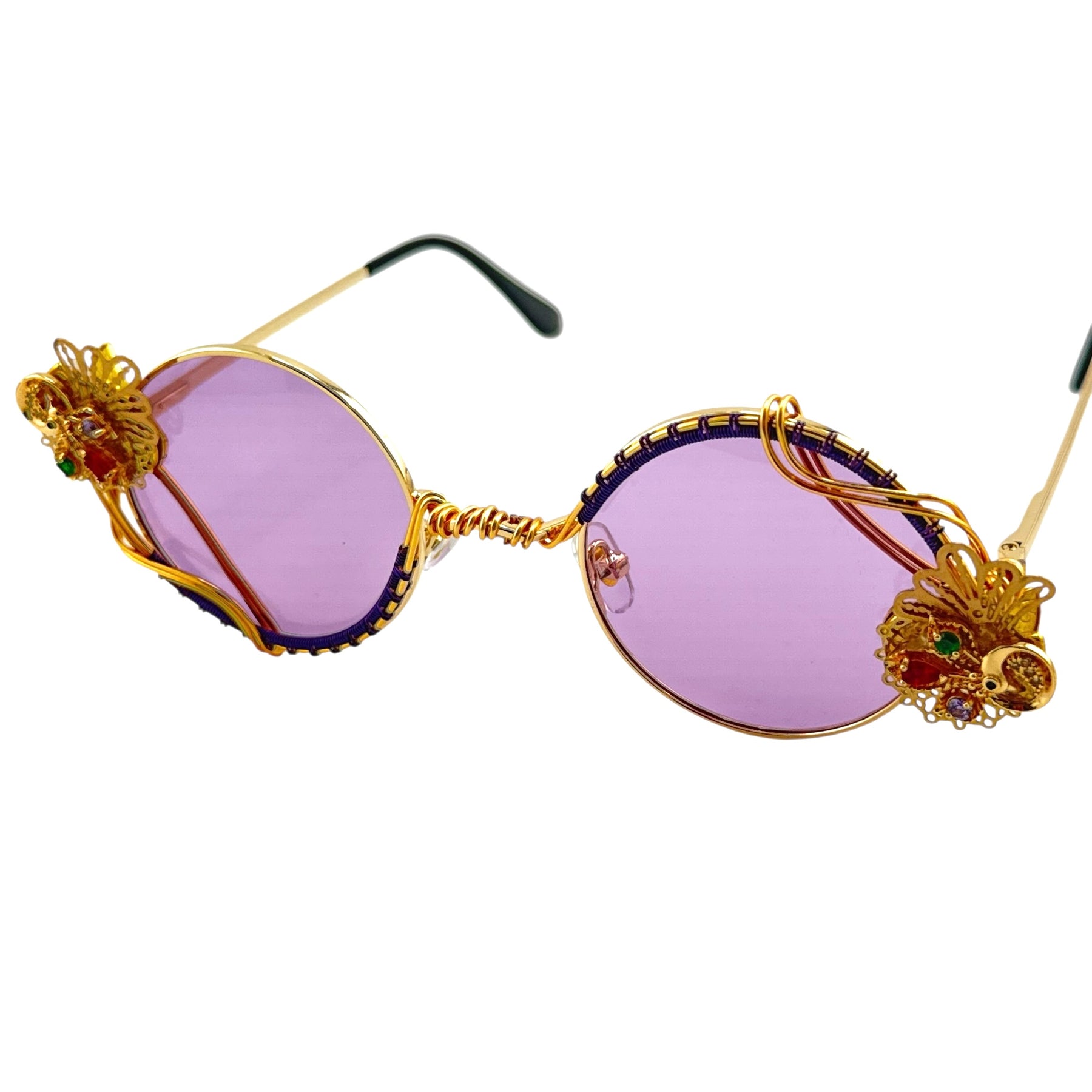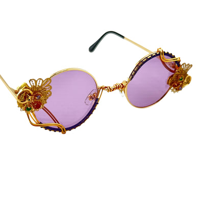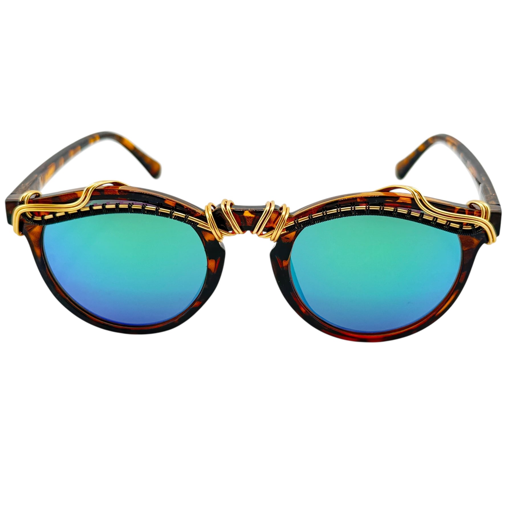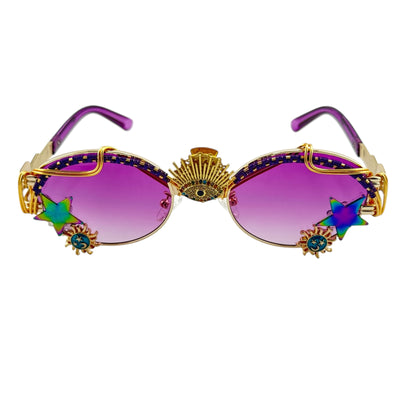 This one-of-a-kind design features a jeweled enamel cat centerpiece wrapped in shimmering teal and gold wirework, paired with blue–green color-shift lenses that glow from every angle. Each side is finished with dramatic crystal starburst clusters, creating a fully dimensional, light-catching effect.