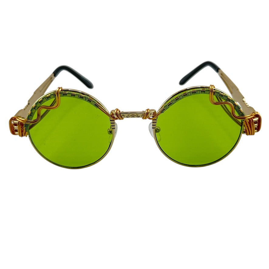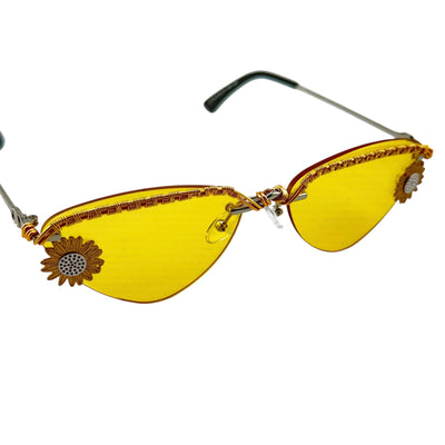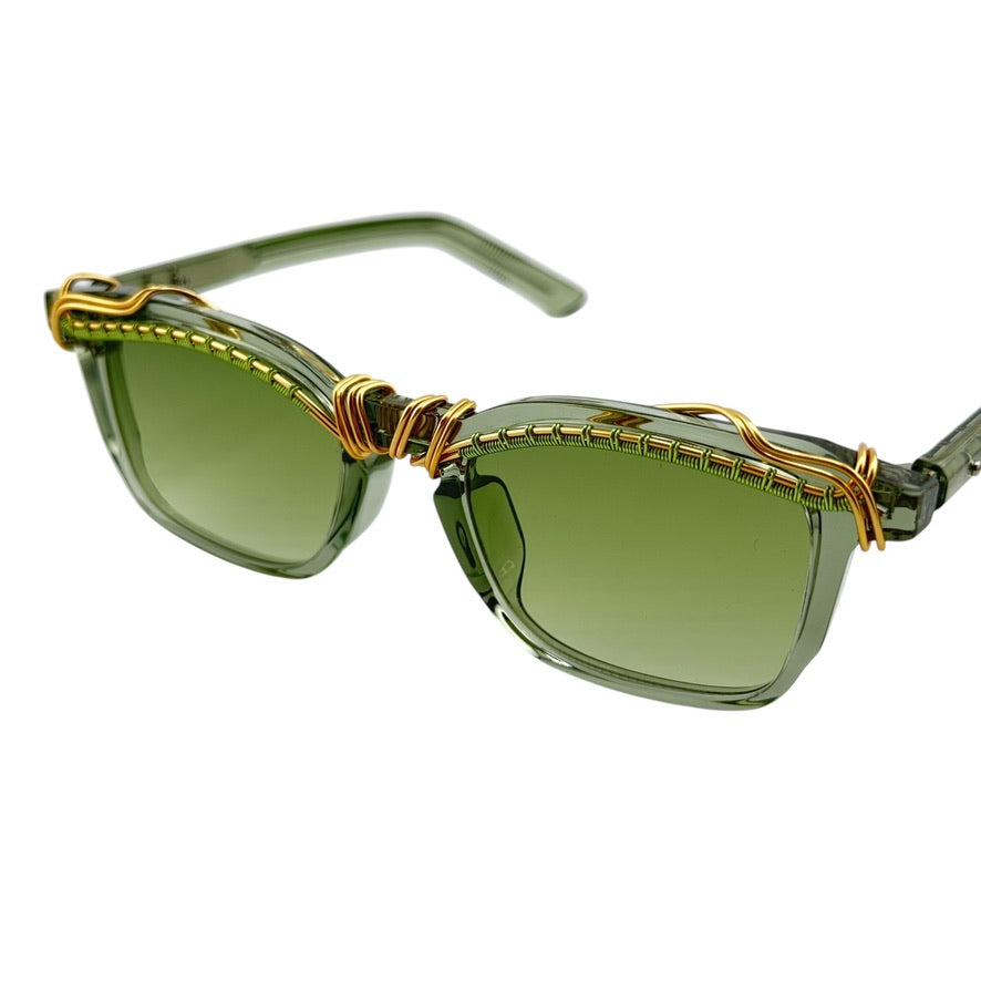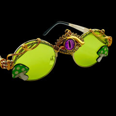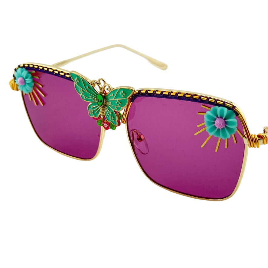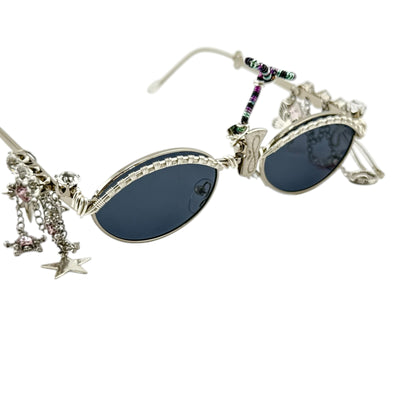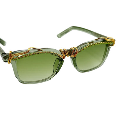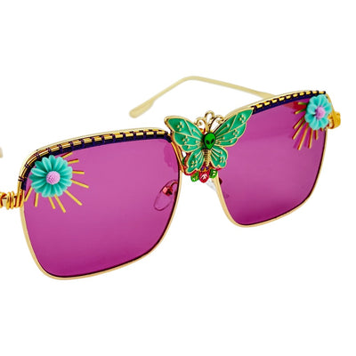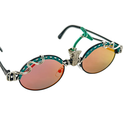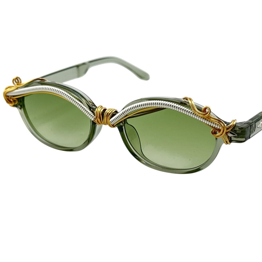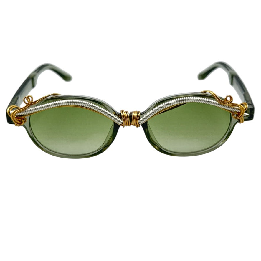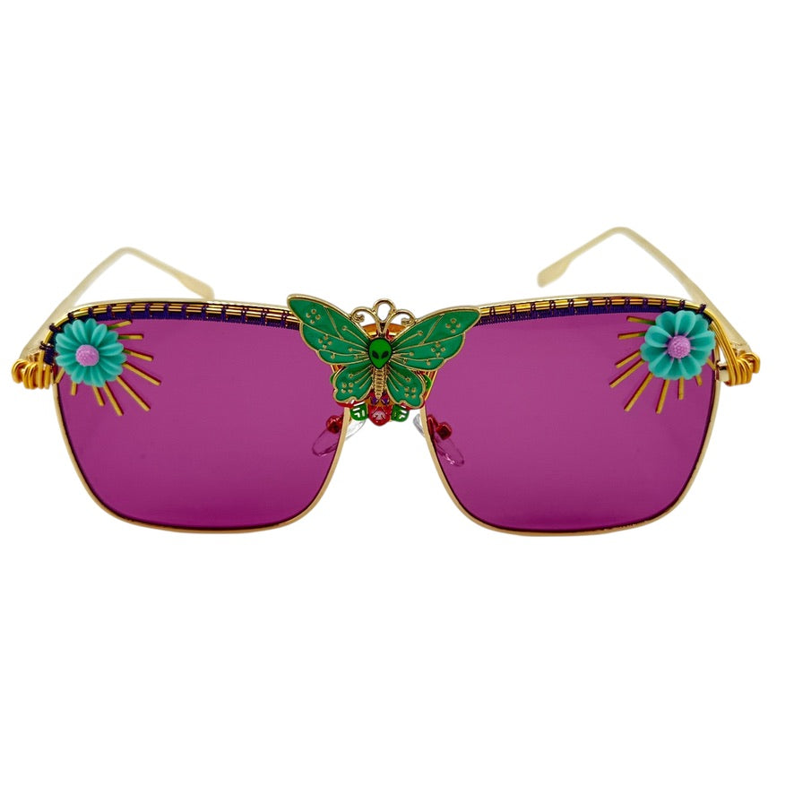 This one-of-a-kind design features a jeweled enamel cat centerpiece wrapped in shimmering teal and gold wirework, paired with blue–green color-shift lenses that glow from every angle. Each side is finished with dramatic crystal starburst clusters, creating a fully dimensional, light-catching effect.