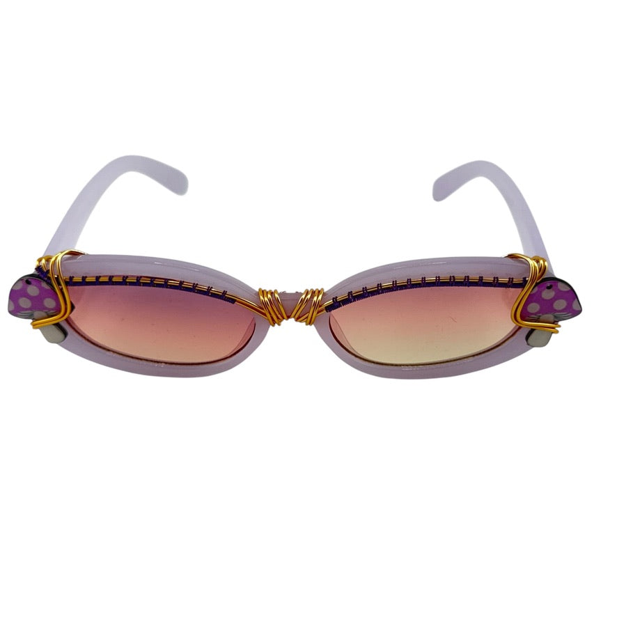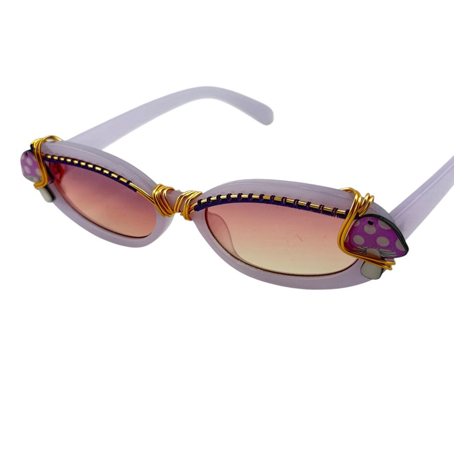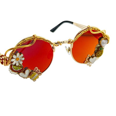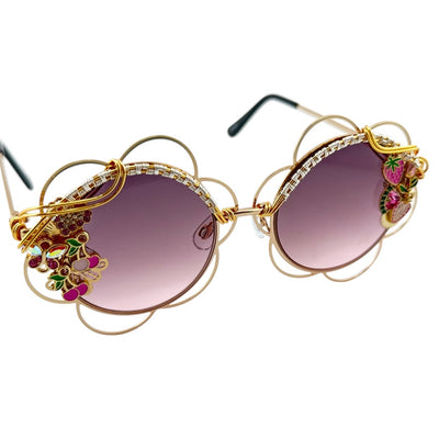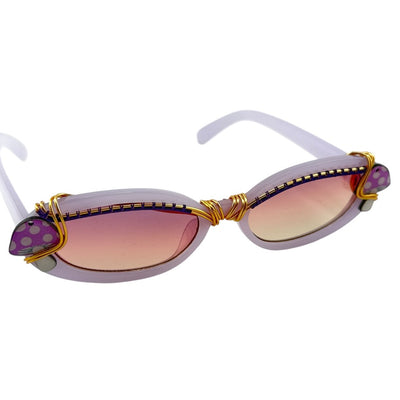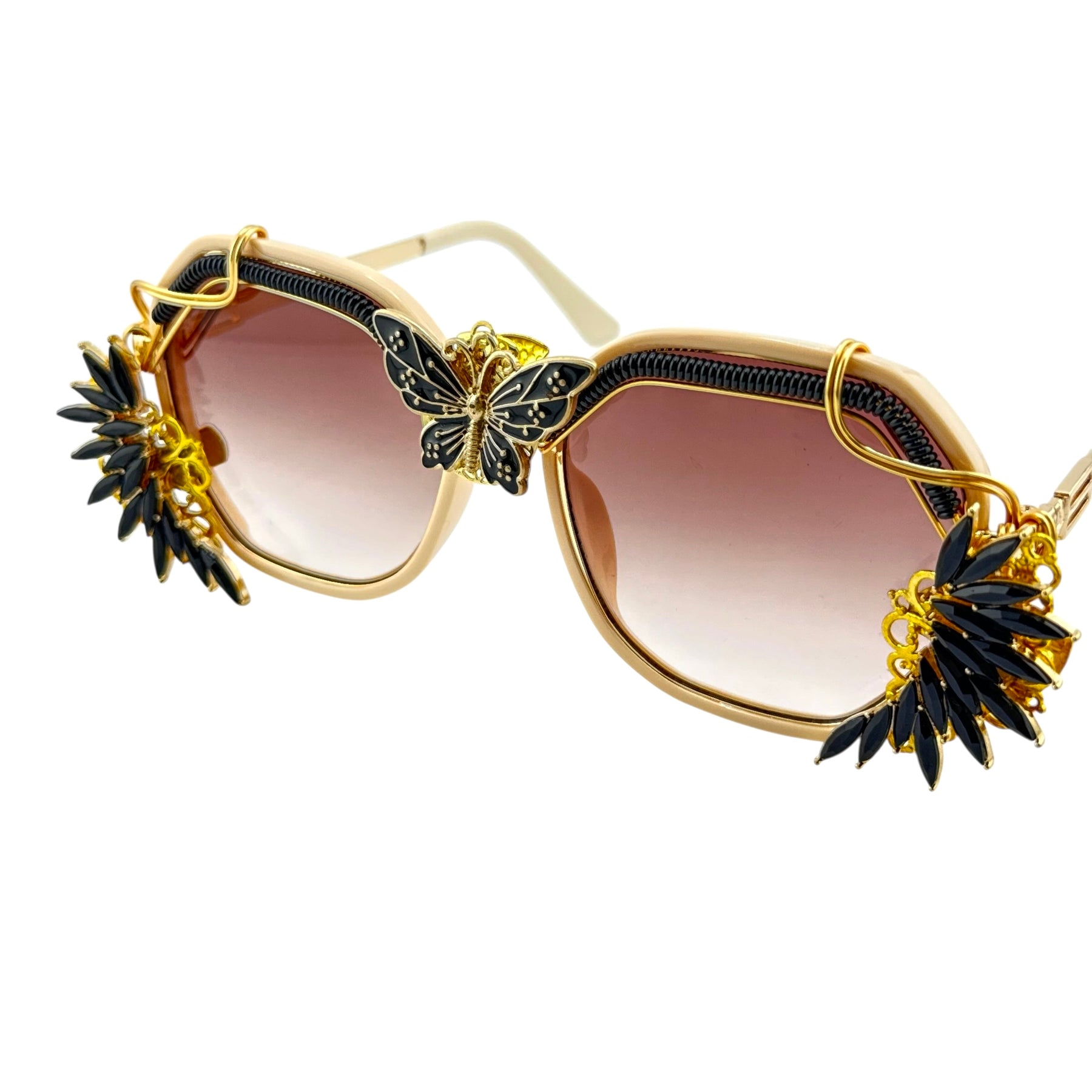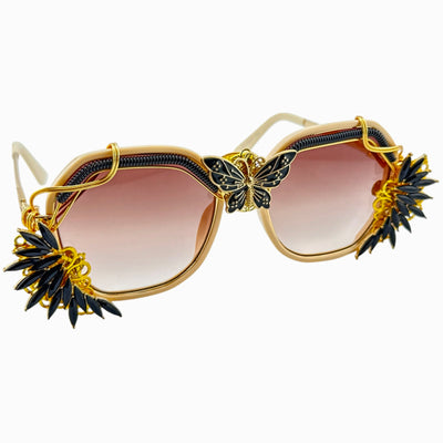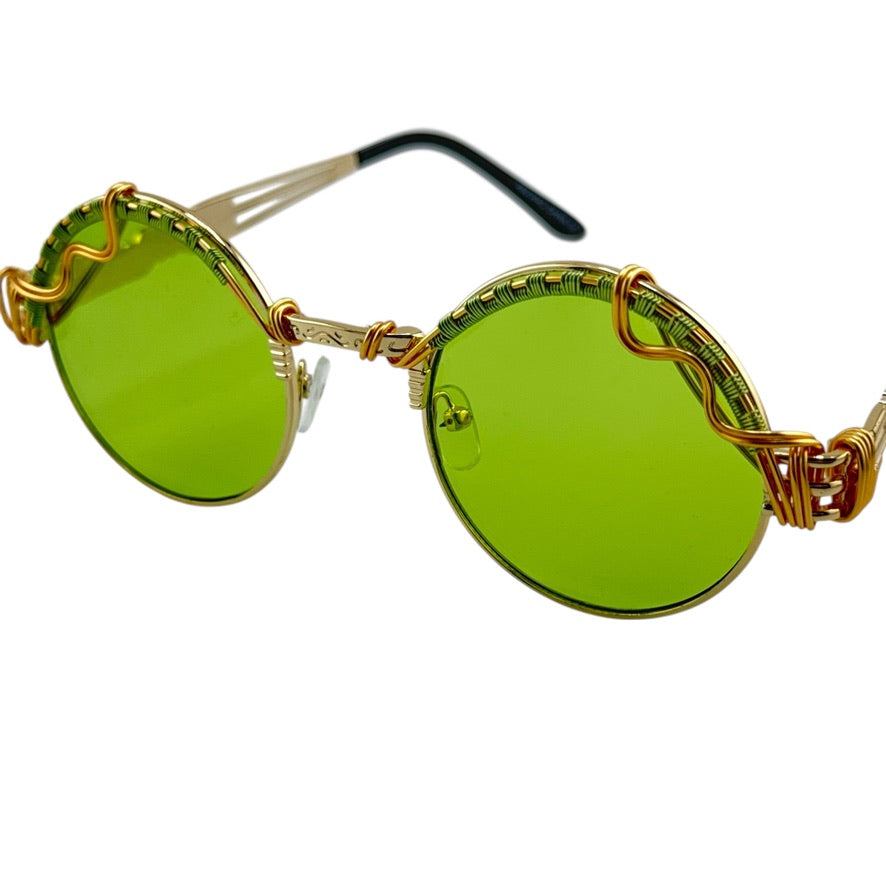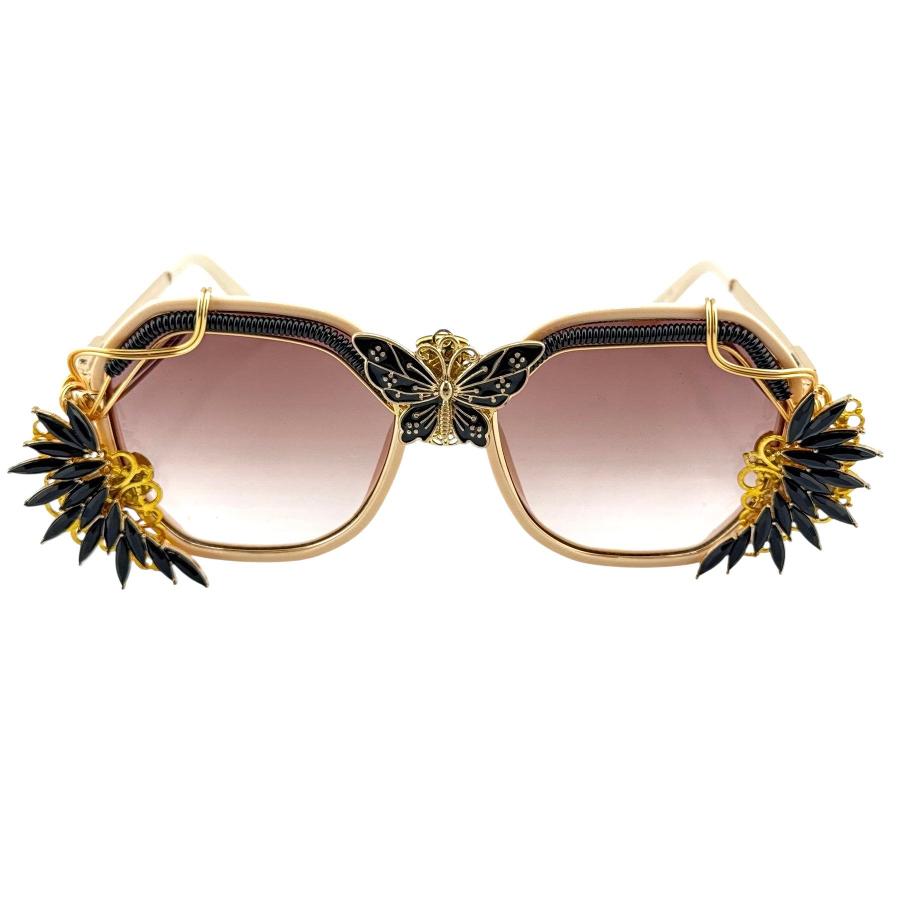 This one-of-a-kind design features a jeweled enamel cat centerpiece wrapped in shimmering teal and gold wirework, paired with blue–green color-shift lenses that glow from every angle. Each side is finished with dramatic crystal starburst clusters, creating a fully dimensional, light-catching effect.