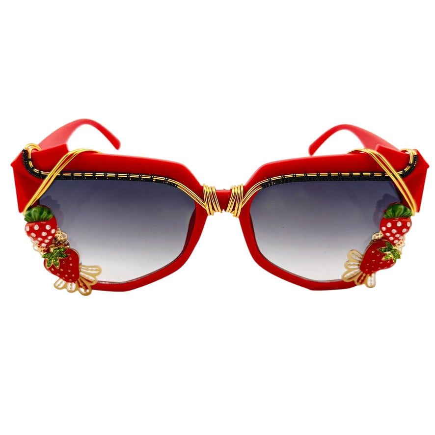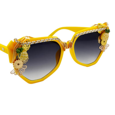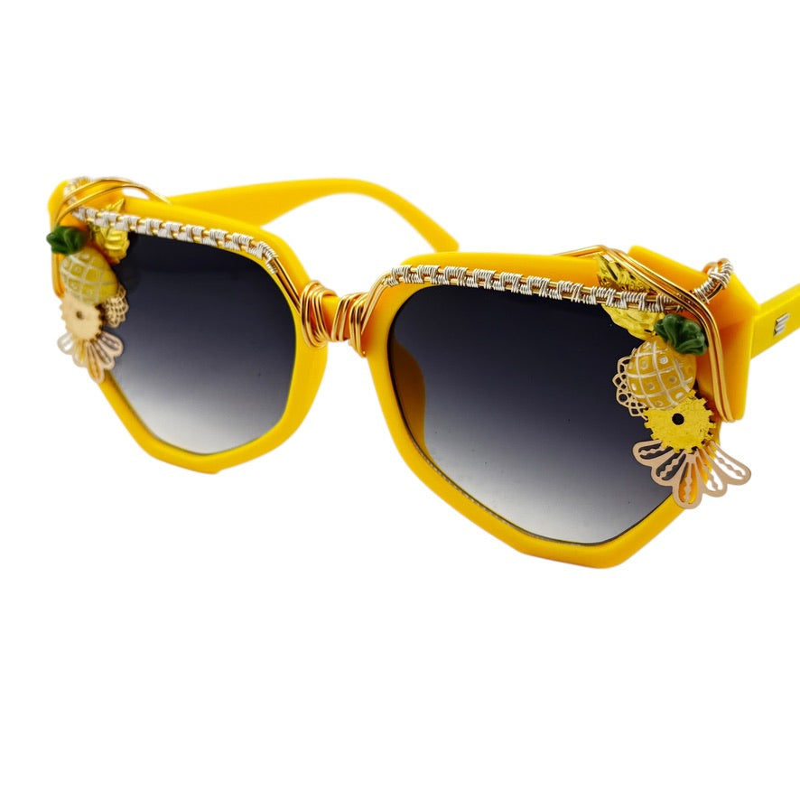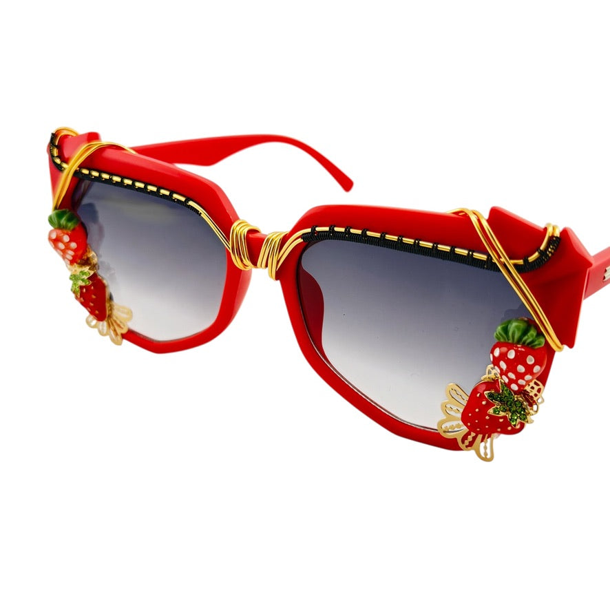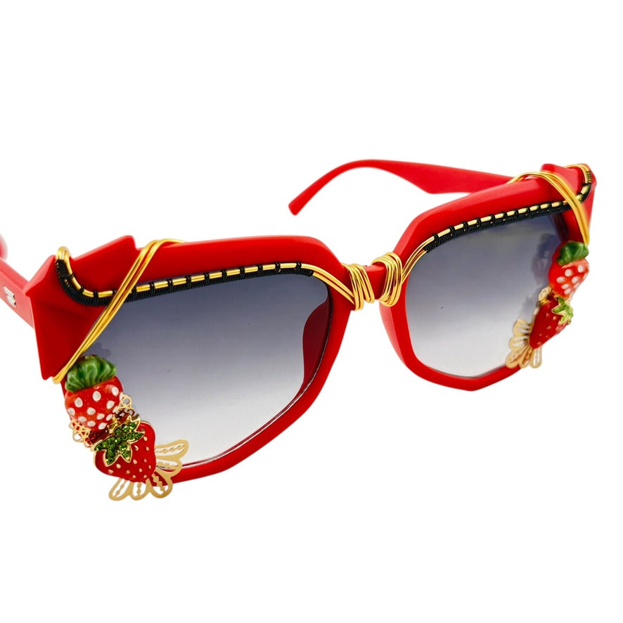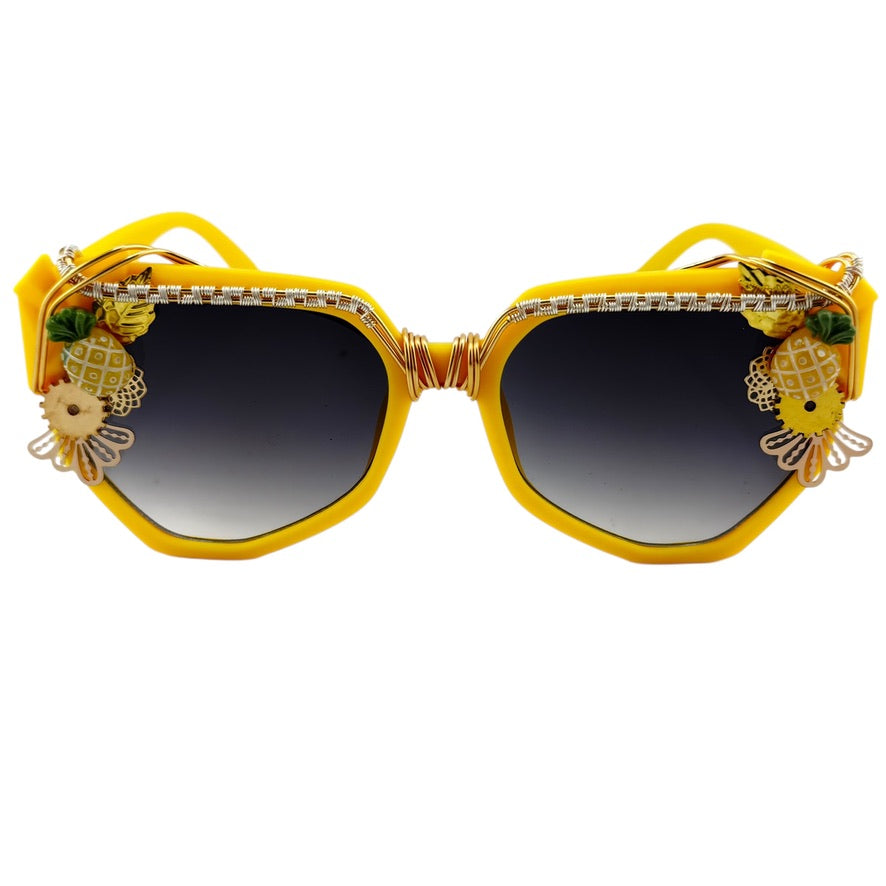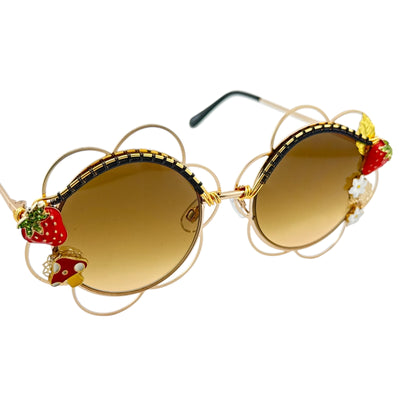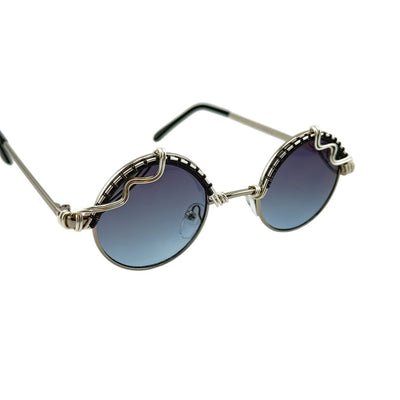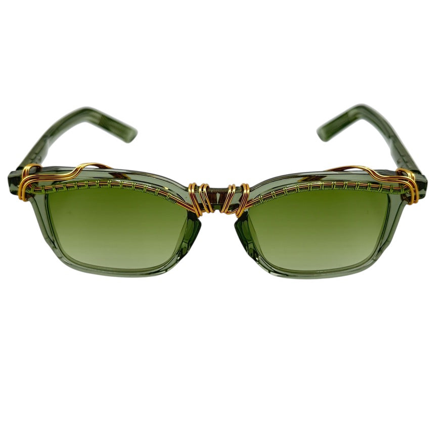 This one-of-a-kind design features a jeweled enamel cat centerpiece wrapped in shimmering teal and gold wirework, paired with blue–green color-shift lenses that glow from every angle. Each side is finished with dramatic crystal starburst clusters, creating a fully dimensional, light-catching effect.