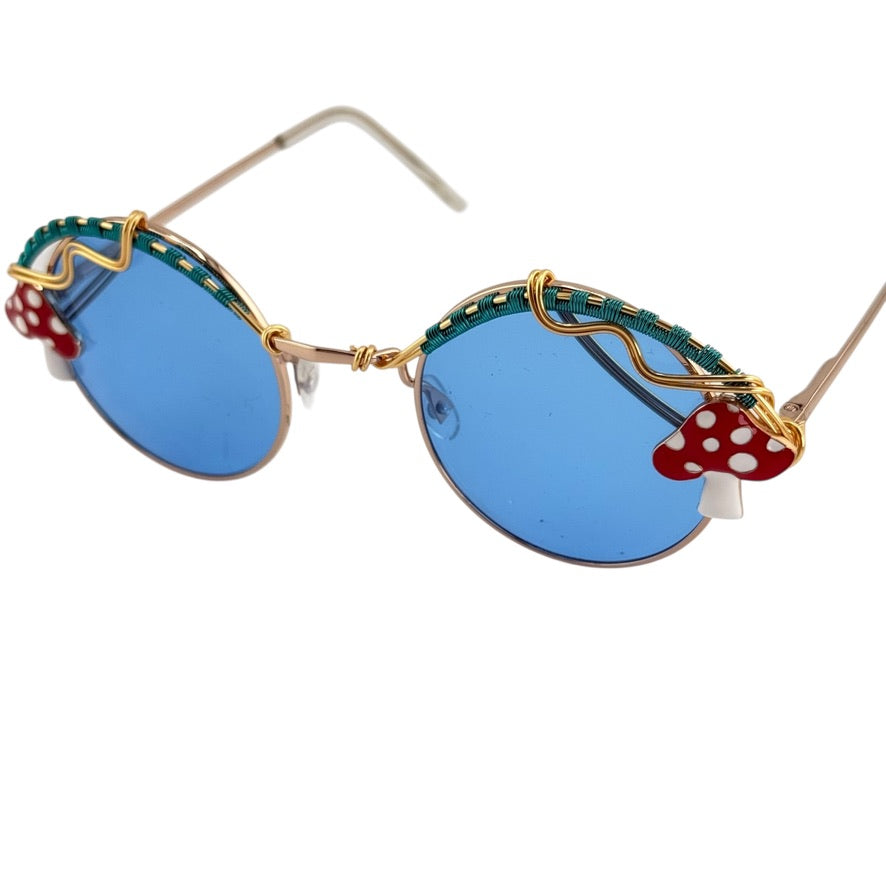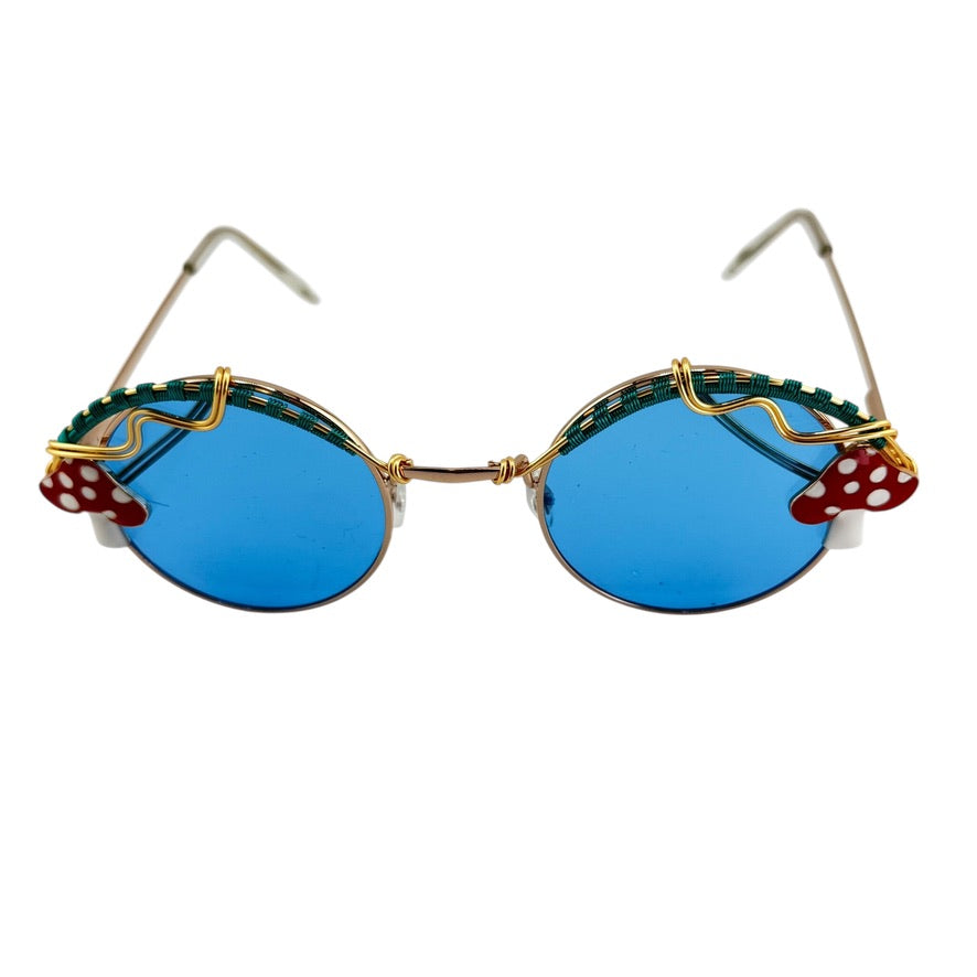These round, blue-tinted lenses are finished with hand-set mushroom details. Built to stay put while you're moving and designed to never turn green on you.