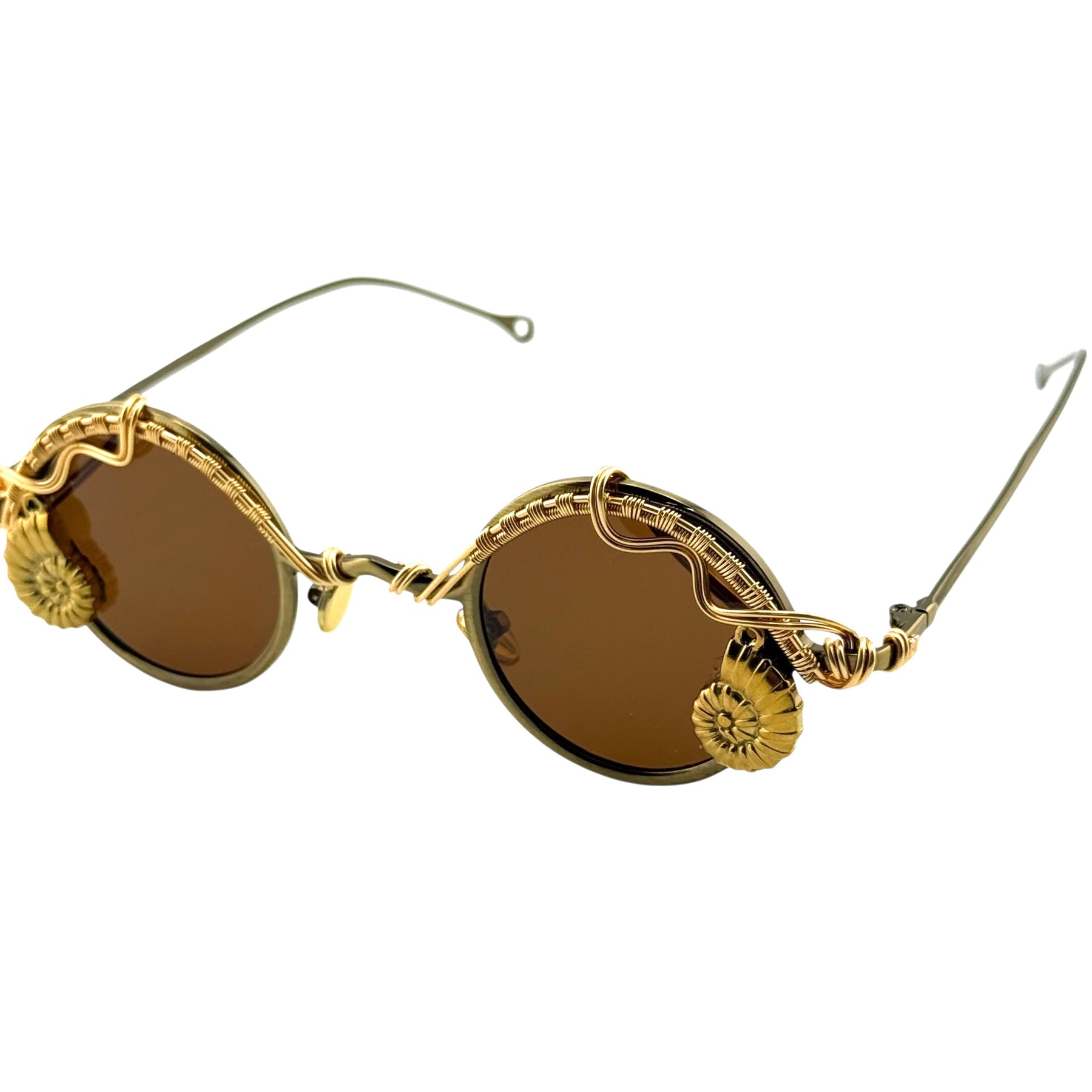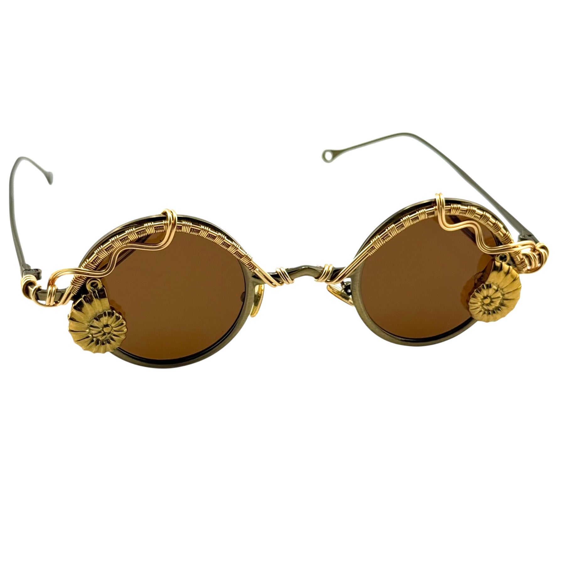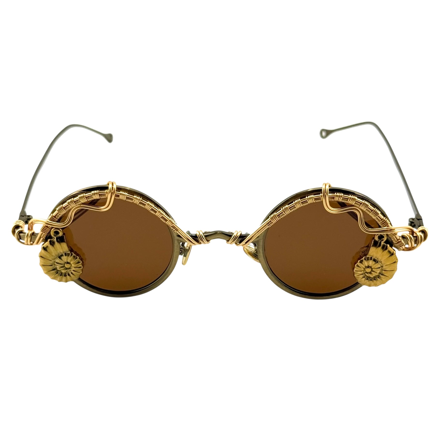 Round reflective sunglasses with black frames, copper wire detailing, and metal ammonite side pieces. Warm copper-toned lenses give this pair an earthy, grounded look that still feels bold.
