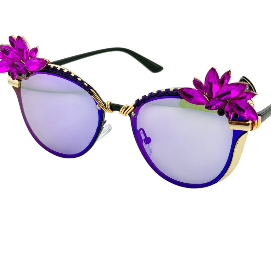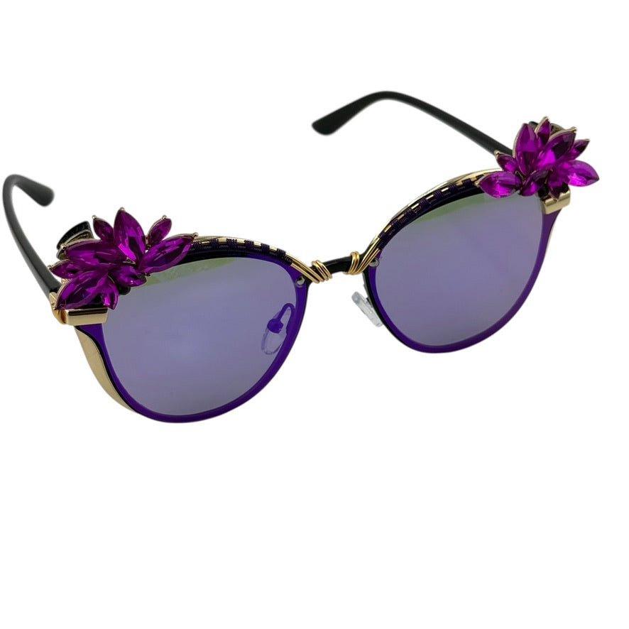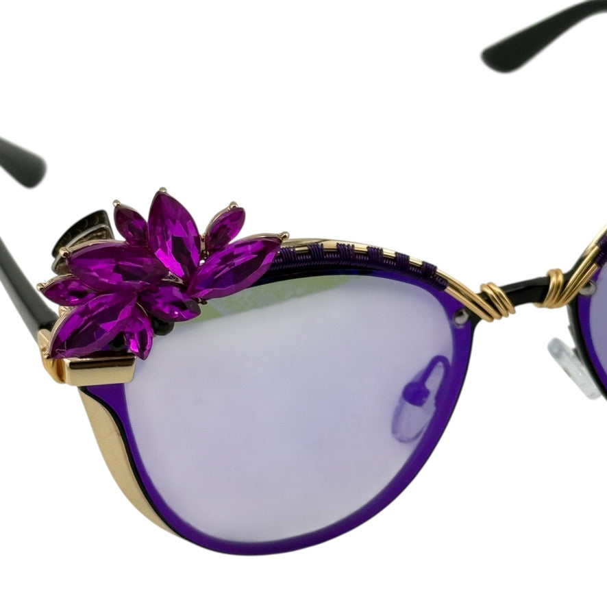 Purple-lens Spunglasses with gold wire detailing and detachable SpunClip™ crystal blooms. The lenses glow lavender in the sun and go deep violet under stage lights, made to pop from golden hour straight through late night sets.
