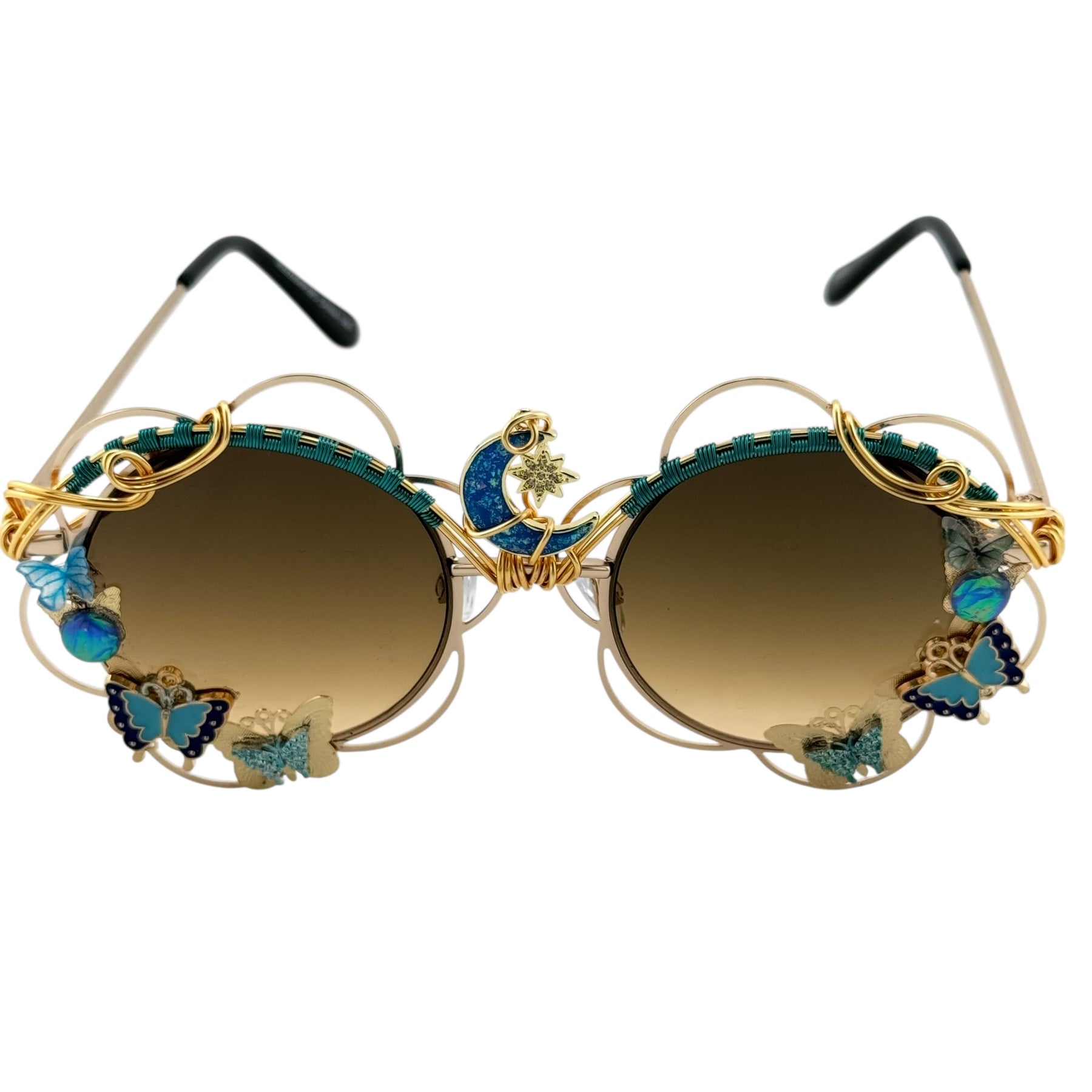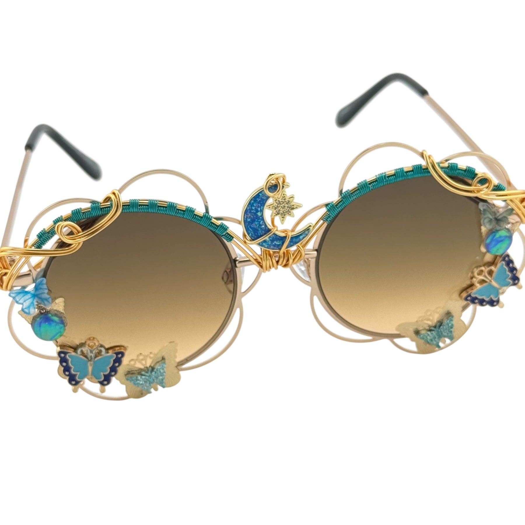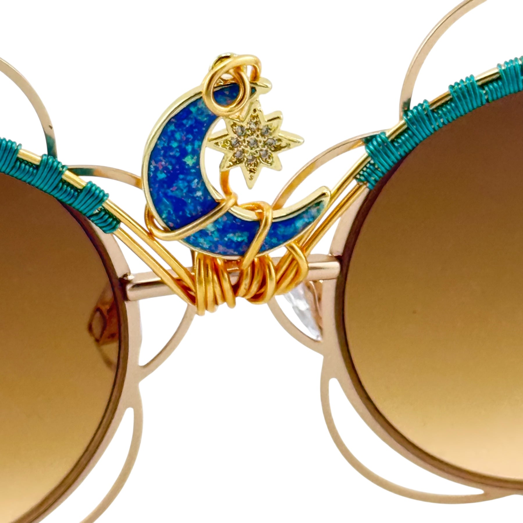 Soft, luminous, and celestial. Opal Moonflower features warm brown gradient lenses wrapped in teal and gold wire, finished with an opal crescent moon and star centerpiece and layered butterfly accents for a dreamy, floating effect.
