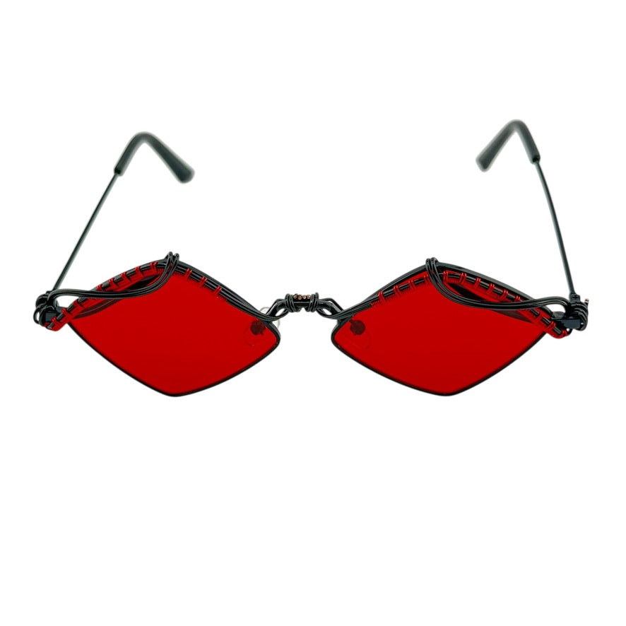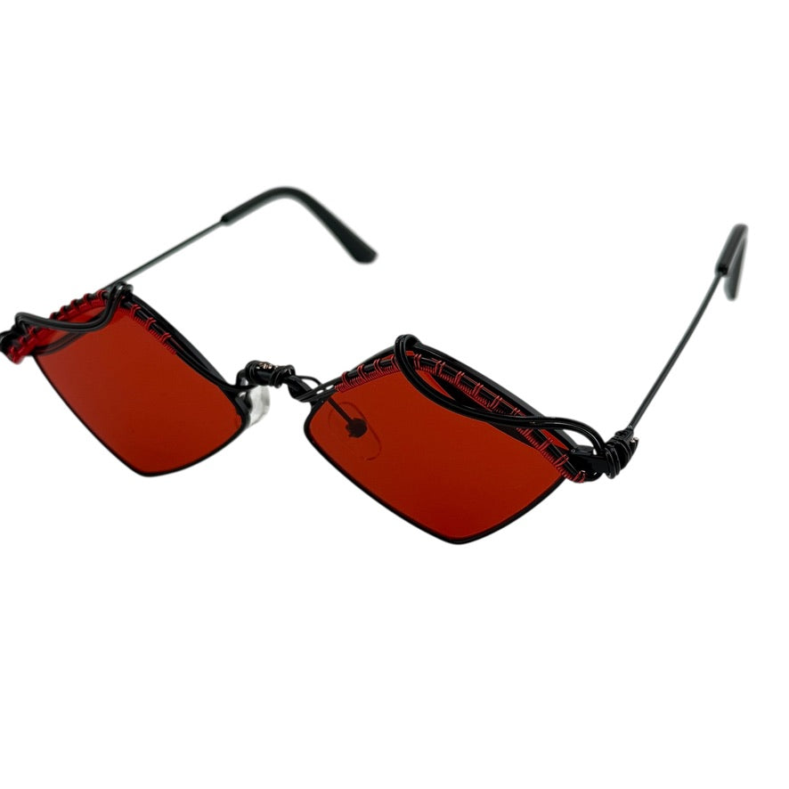 RED RAVE is sharp, dark, and built for night energy. A narrow, angular frame wrapped in black wire with deep red lenses that hit hard under lights. Sleek, aggressive, and unapologetic.