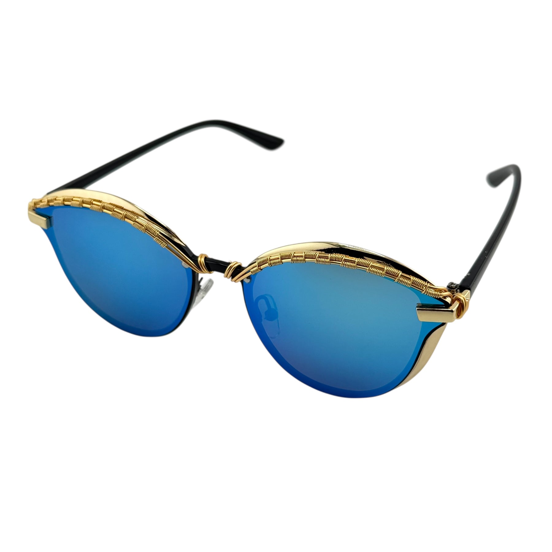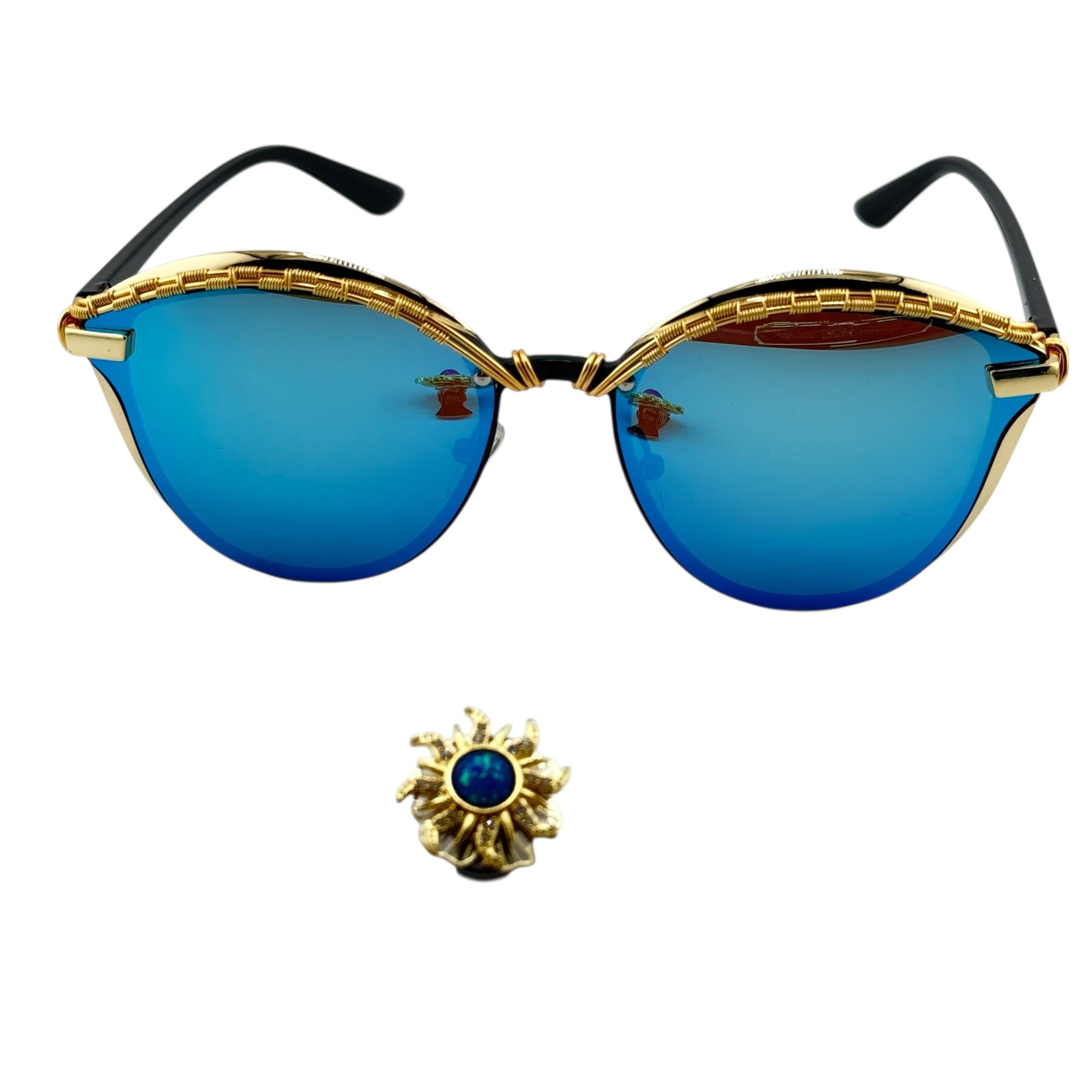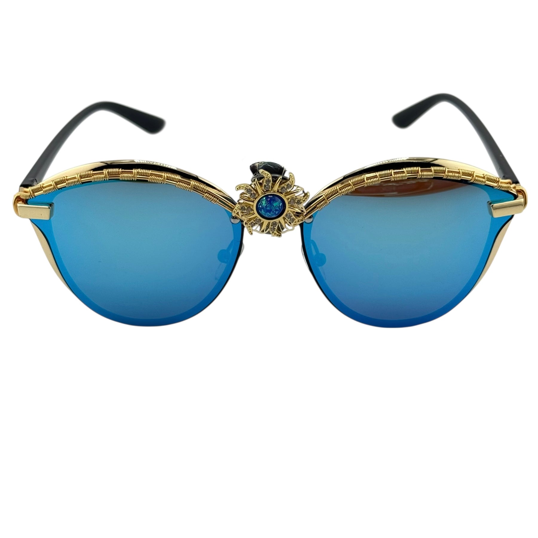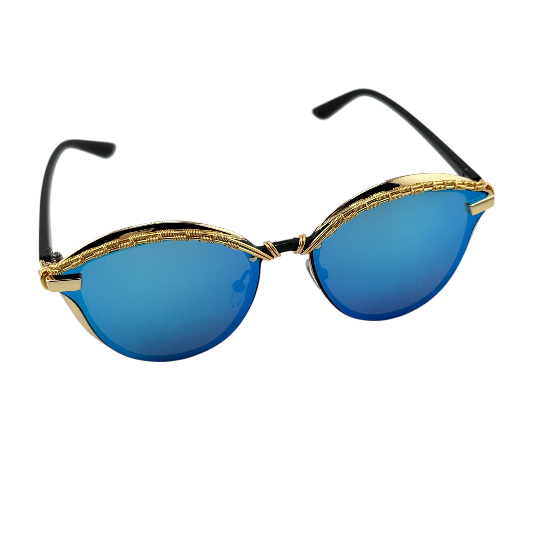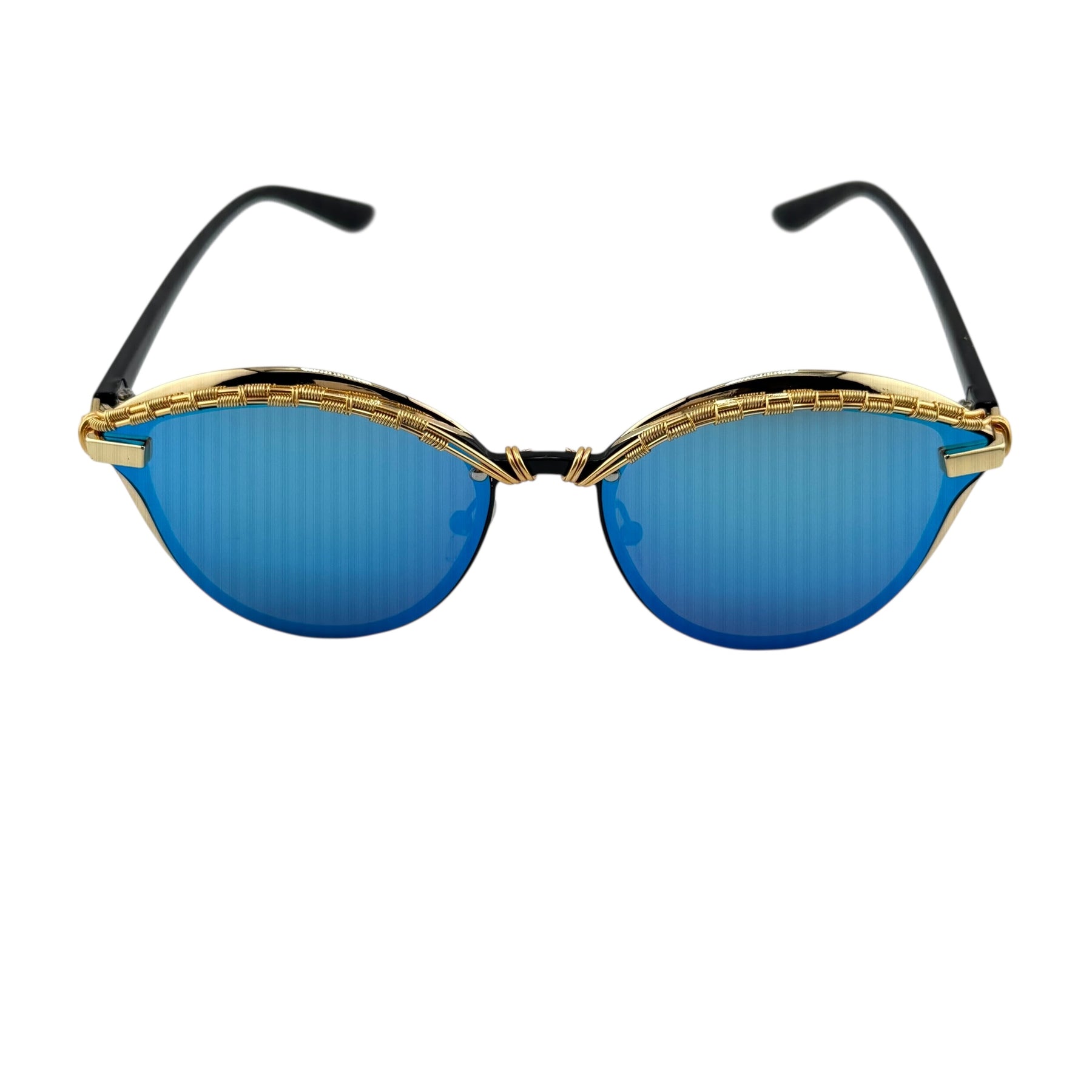 Classic cat-eye sunglasses with black frames and reflective blue lenses, finished with hand-wrapped copper detailing along the brow. The look is clean, sculpted, and elevated — with just enough edge.