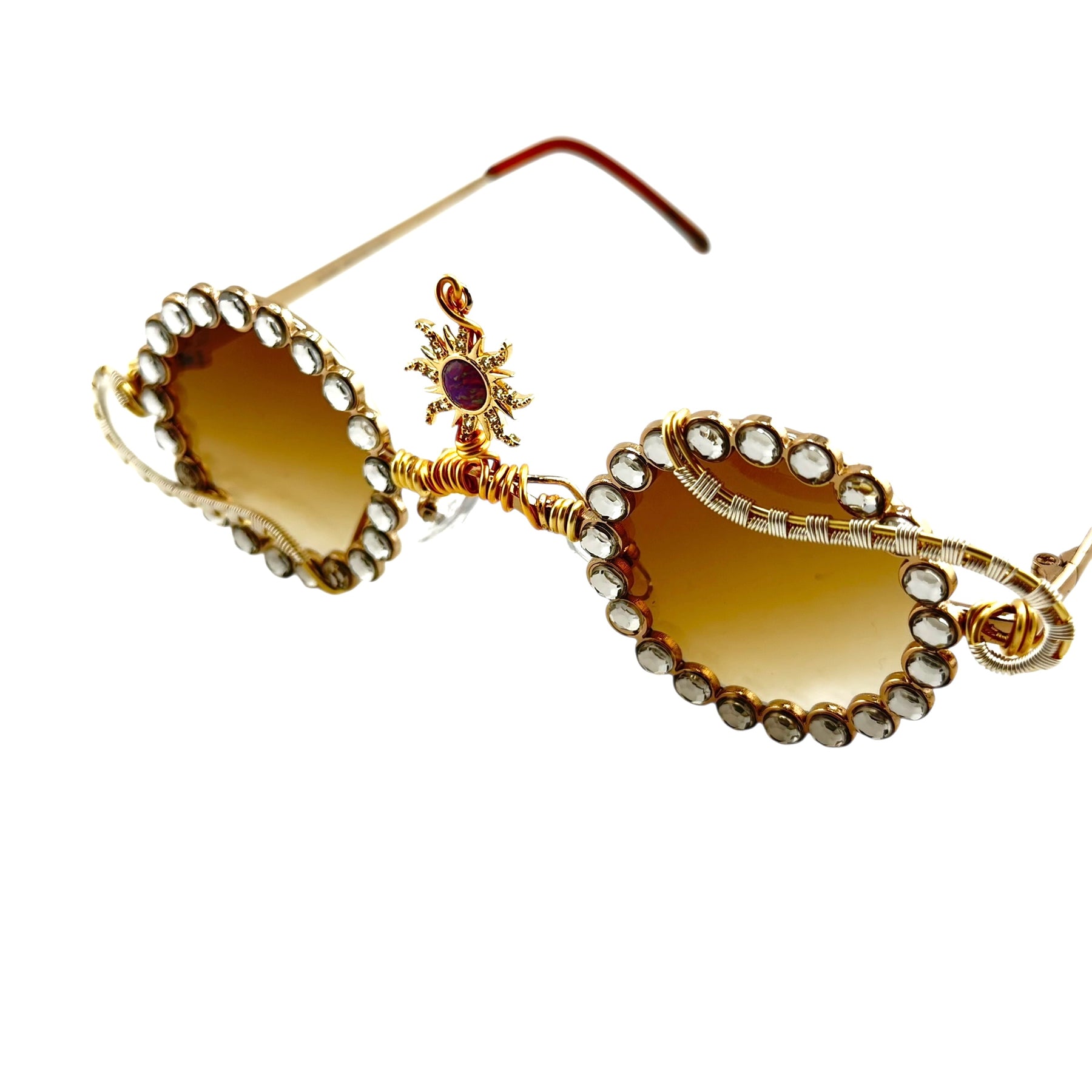 Embellishments: Full crystal halo around each lens, sculptural wire loops, sun charm at the bridge