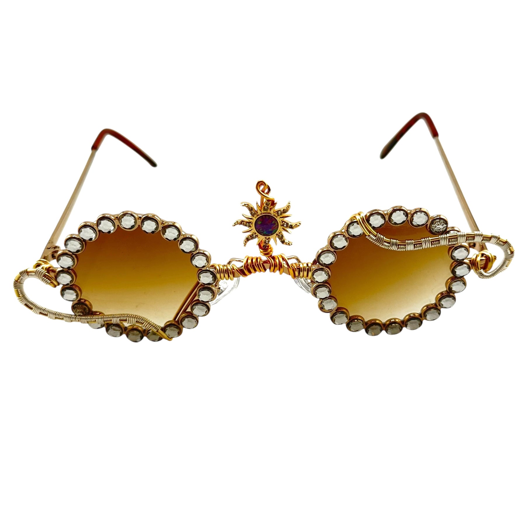 SUN SPARKLES looks like golden hour in disco-ball form. Warm honey-amber lenses sit in a vintage round frame, each one ringed with a full halo of crystals that flash every time you move. Gold and silver wire wrap around the edges in soft loops, and a tiny sun charm at the bridge ties it all together – bright, dreamy, and a little bit rockstar.