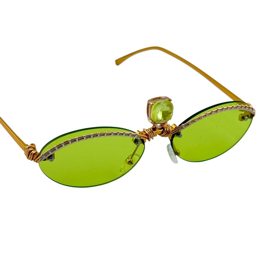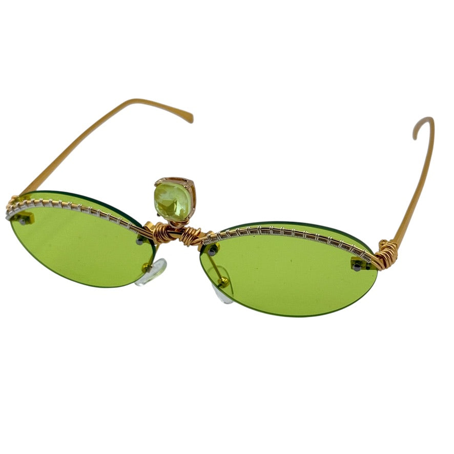 Alien Crystal is a one-of-a-kind pair of Spunglasses, hand wire-wrapped from start to finish in our studio. Featuring slim green oval lenses, gold detailing, and a centered faceted crystal set at the bridge, this pair channels third-eye energy with a sharp, futuristic edge.