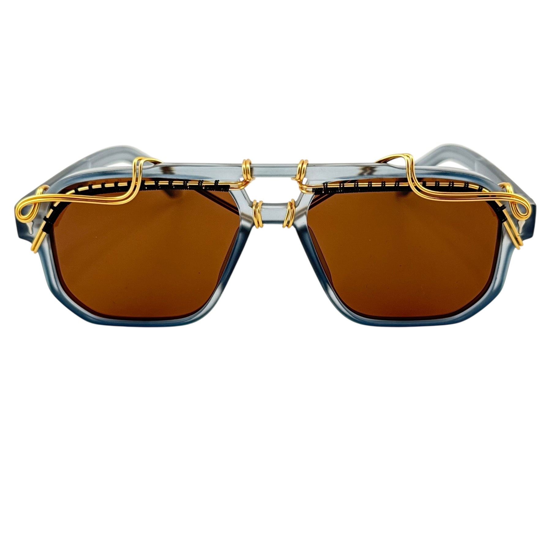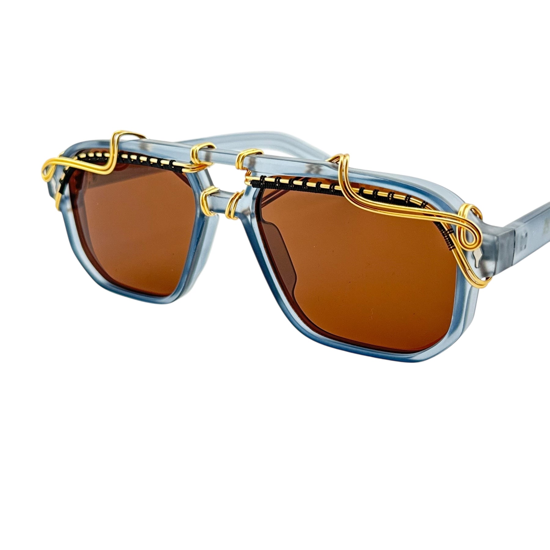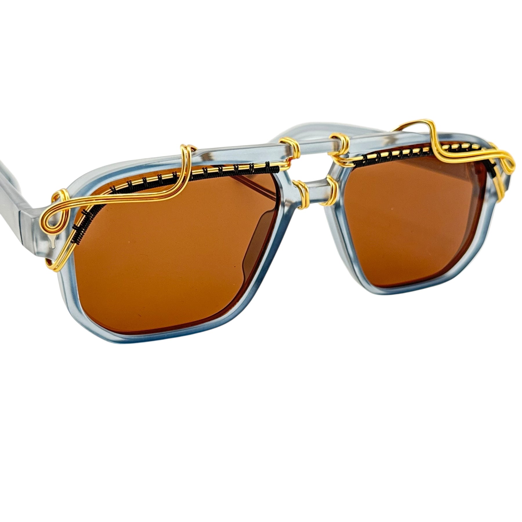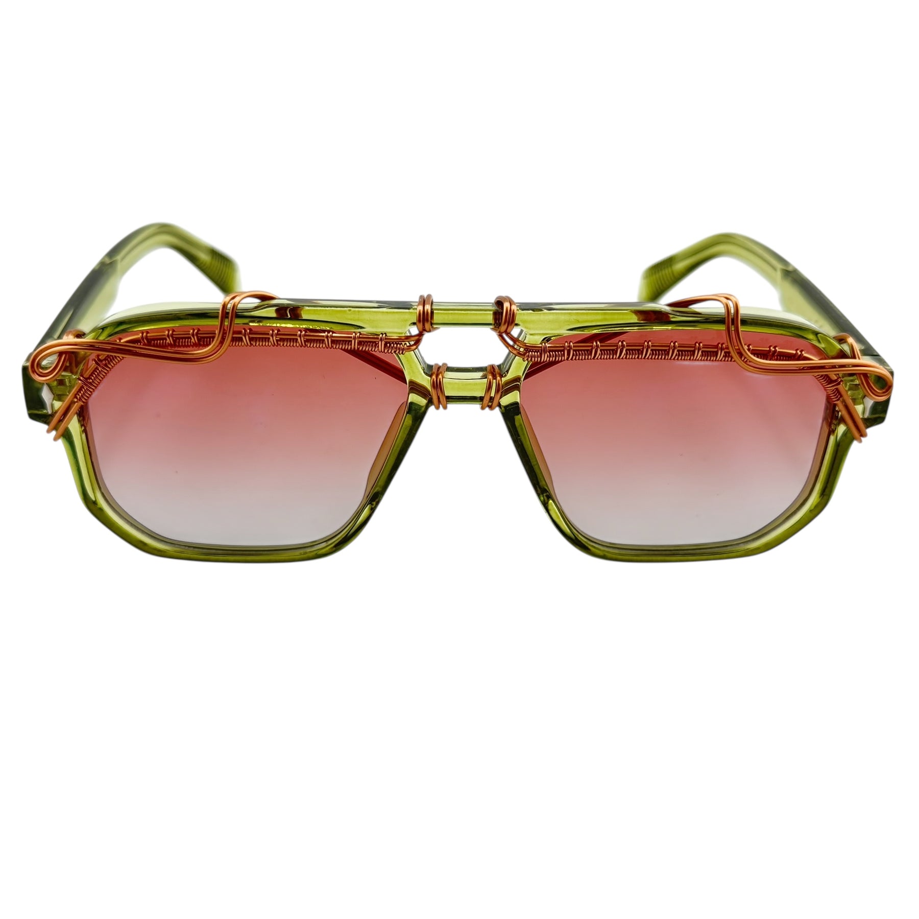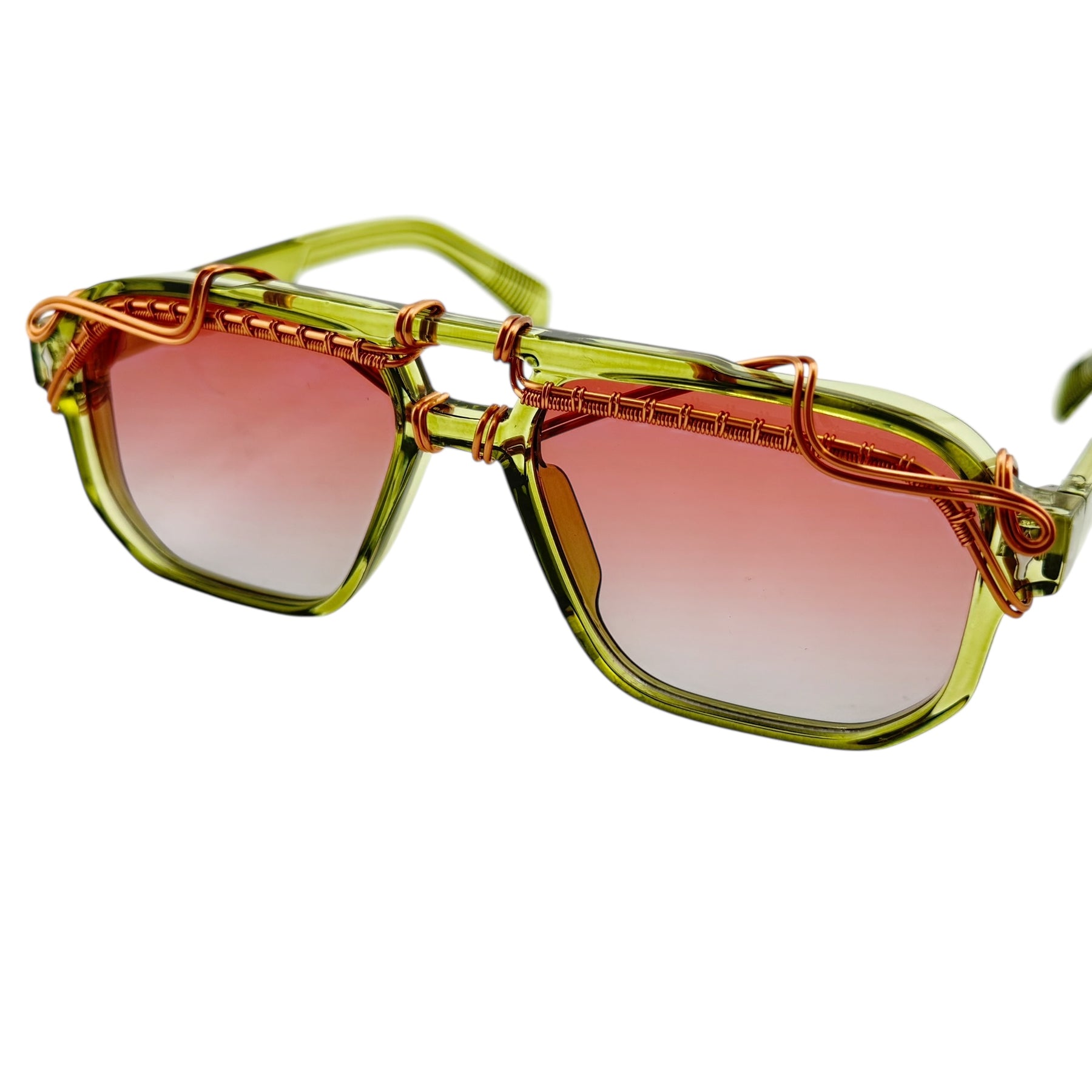 From the SpunLuxe collection, EMERALD BOTANICA is a jeweled garden in motion. A deep emerald squared aviator frame holds rich coral-to-rose gradient lenses, framed with sculpted gold wire that runs clean across the brow. Each corner is finished with layered gold leaves and florals, plus a tiny enamel mushroom cameo tucked into one side – a subtle nod to the forest without feeling cartoonish.