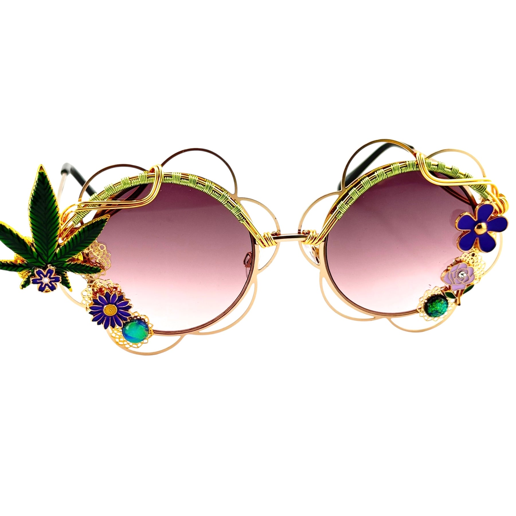 The Offering: A vibrant, handset cannabis leaf serves as the central icon, surrounded by an altar of enamel blooms and iridescent gems that catch the light like stained glass.