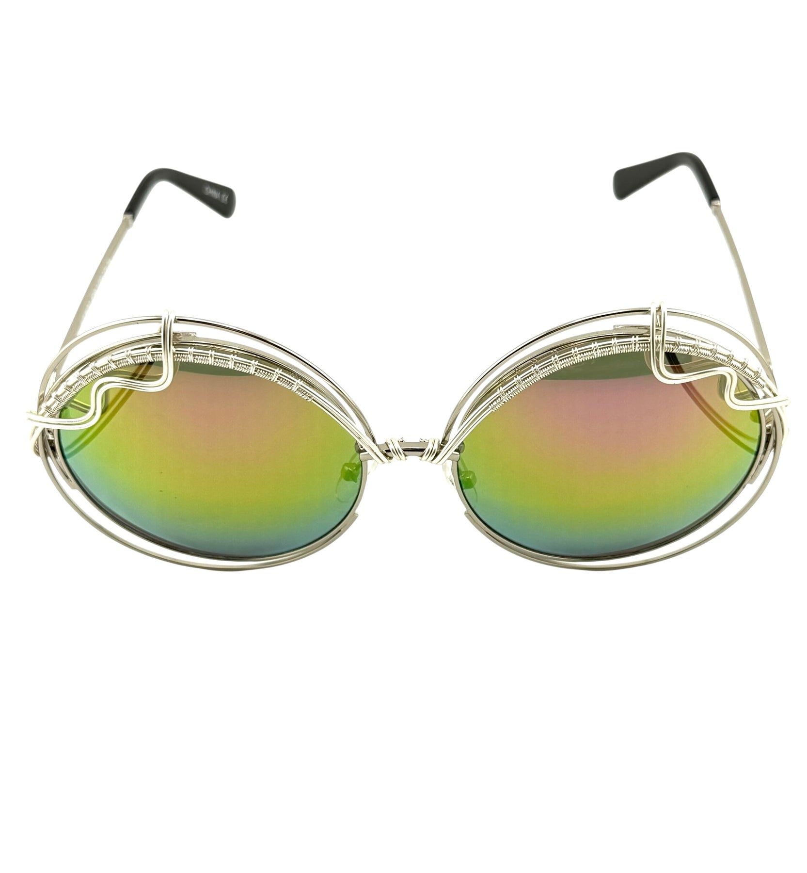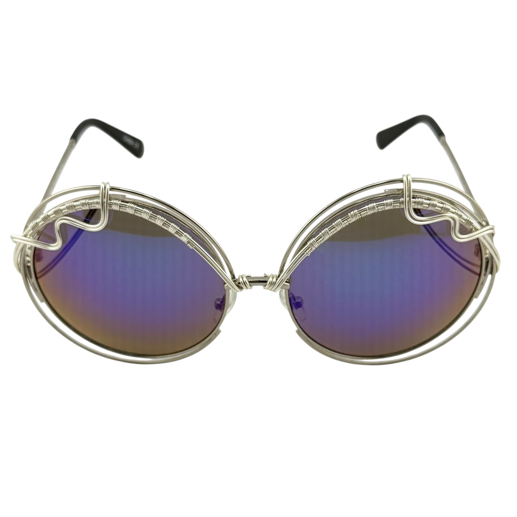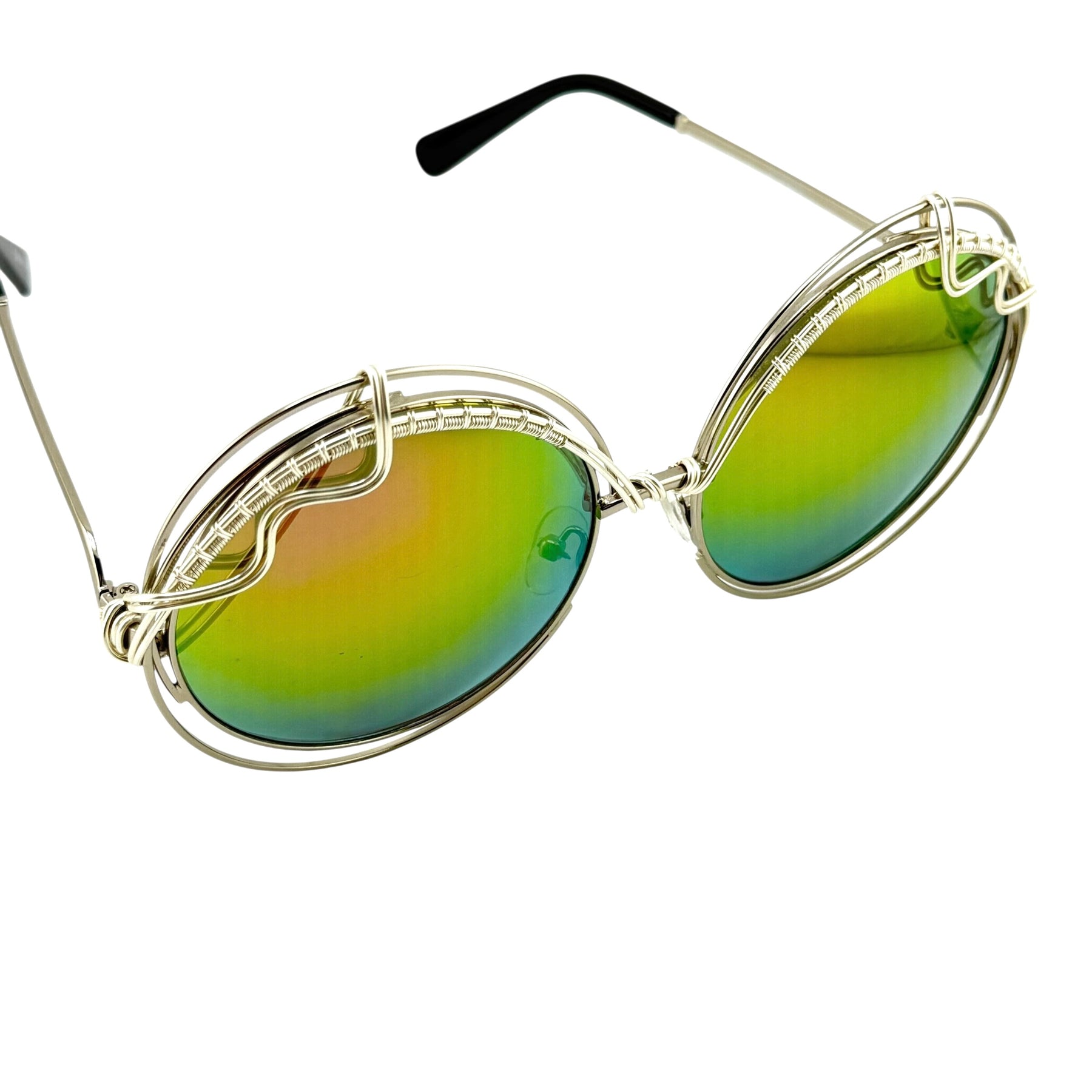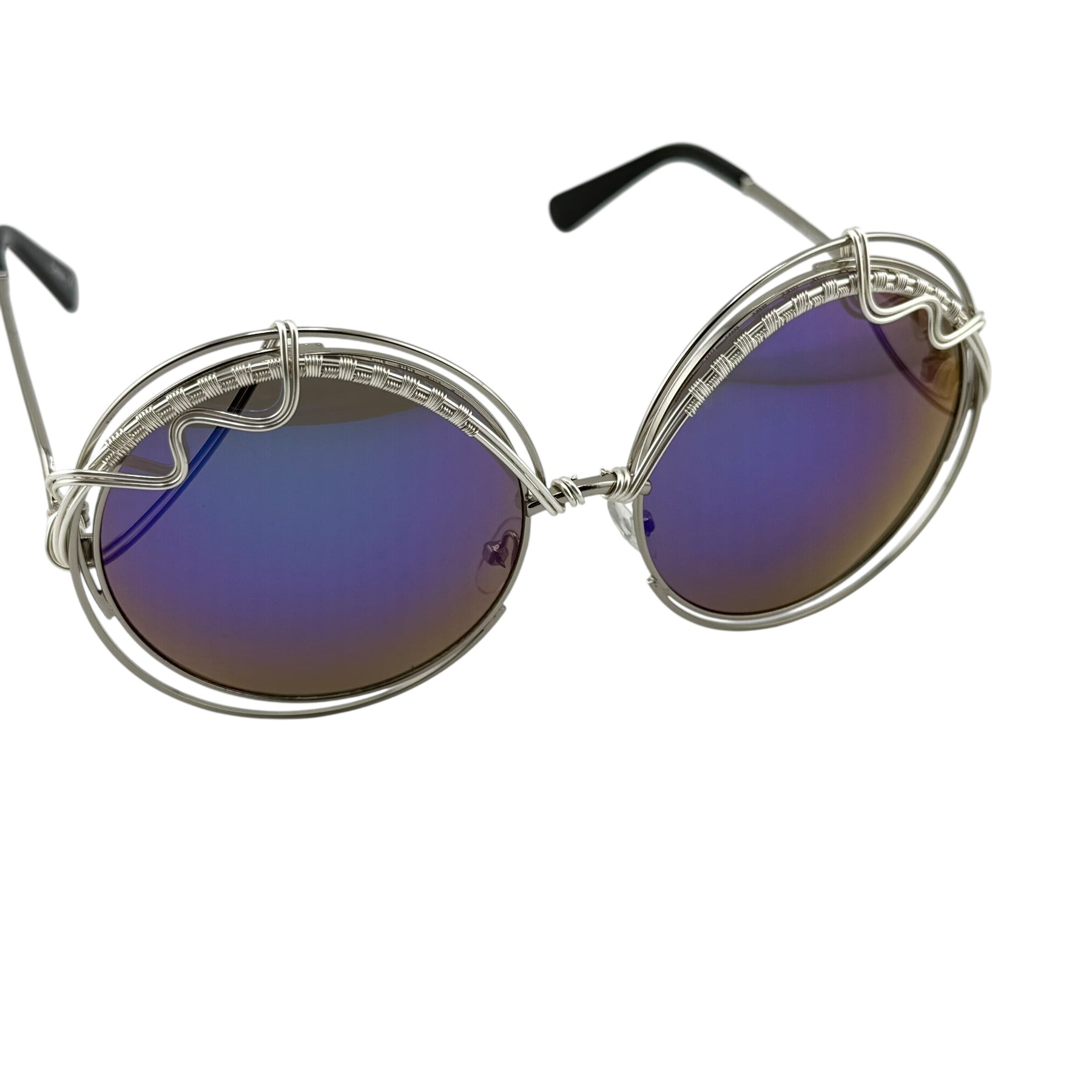 A bold, oversized round with undeniable presence. BIG AURA features very large reflective lenses and our signature Spunglasses detailing—thread-thin, jewelry-grade copper wire, hand-spun directly onto the frame. The non-tarnishing wire adds texture and balance while keeping the look clean and wearable.