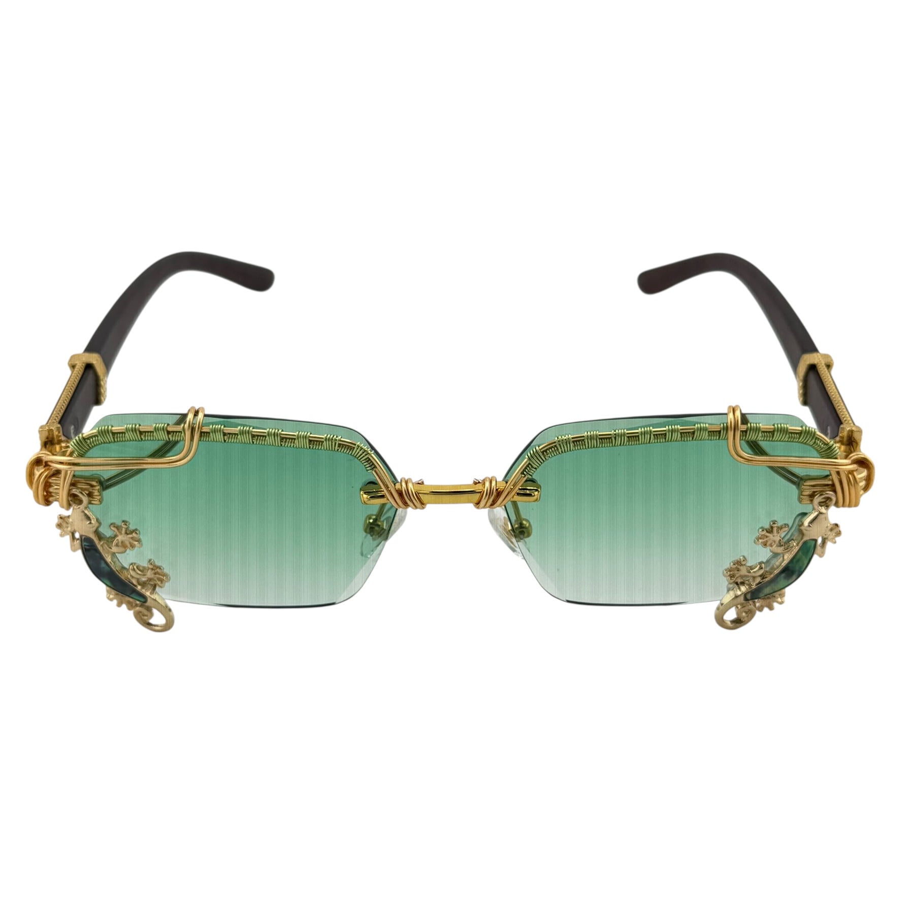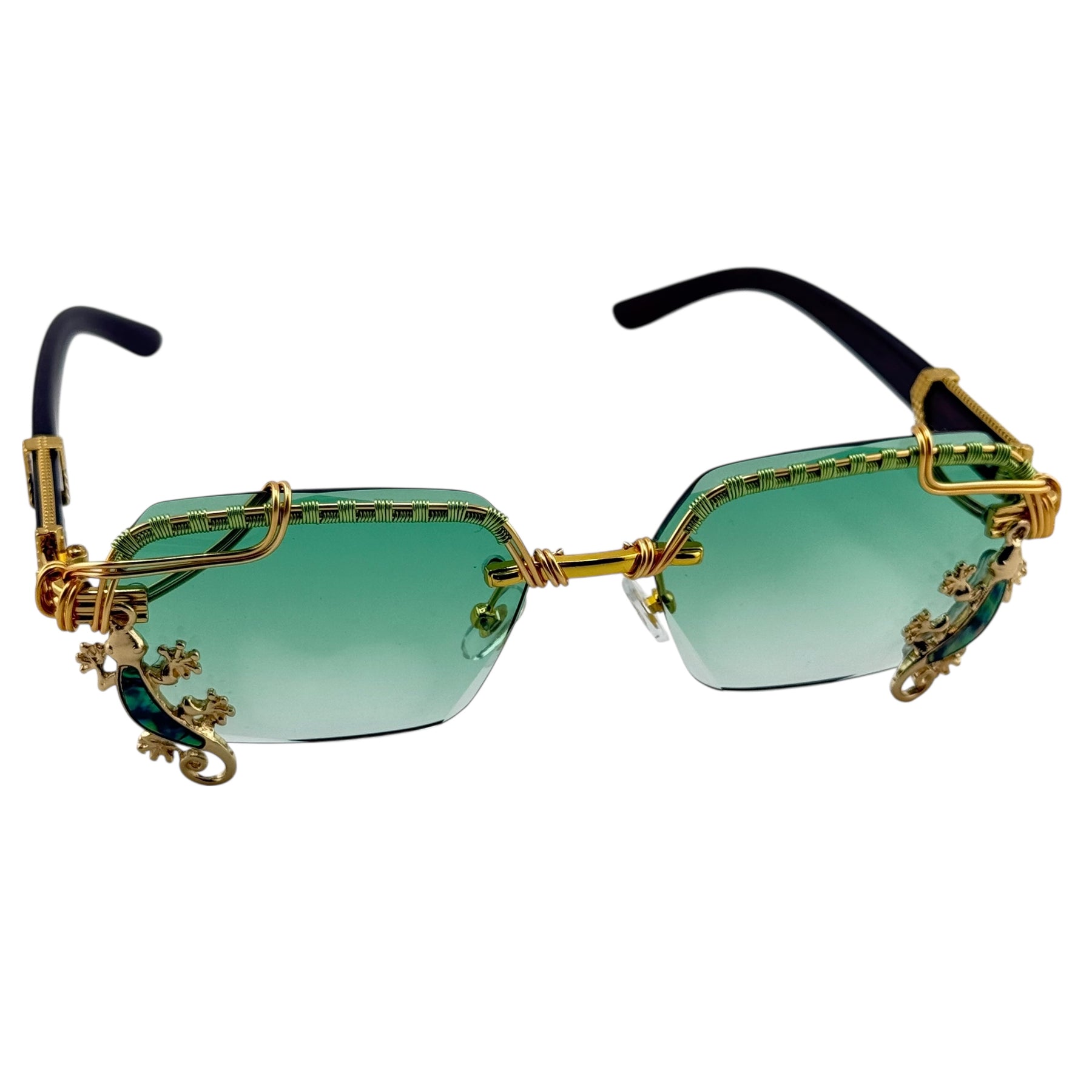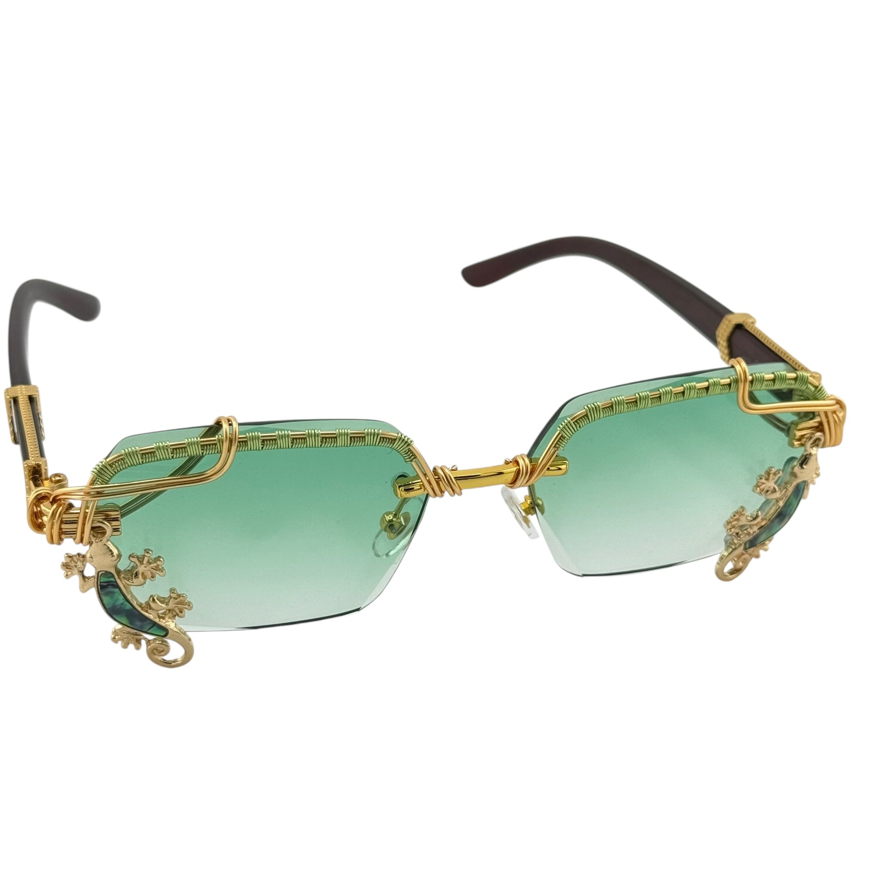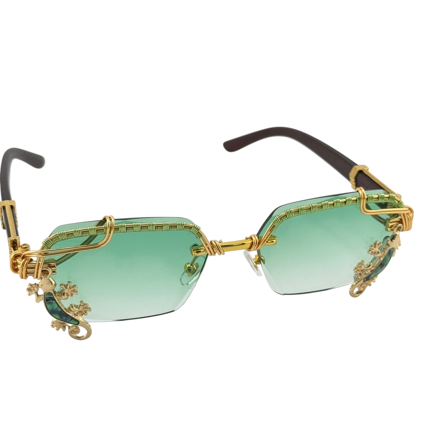 Abalone Gecko is a one-of-a-kind pair of Spunglasses, hand wire-wrapped from start to finish in our studio. Featuring sea-green gradient lenses with gold wire wrapping and abalone gecko accents that flash blue, teal, and violet in the light.