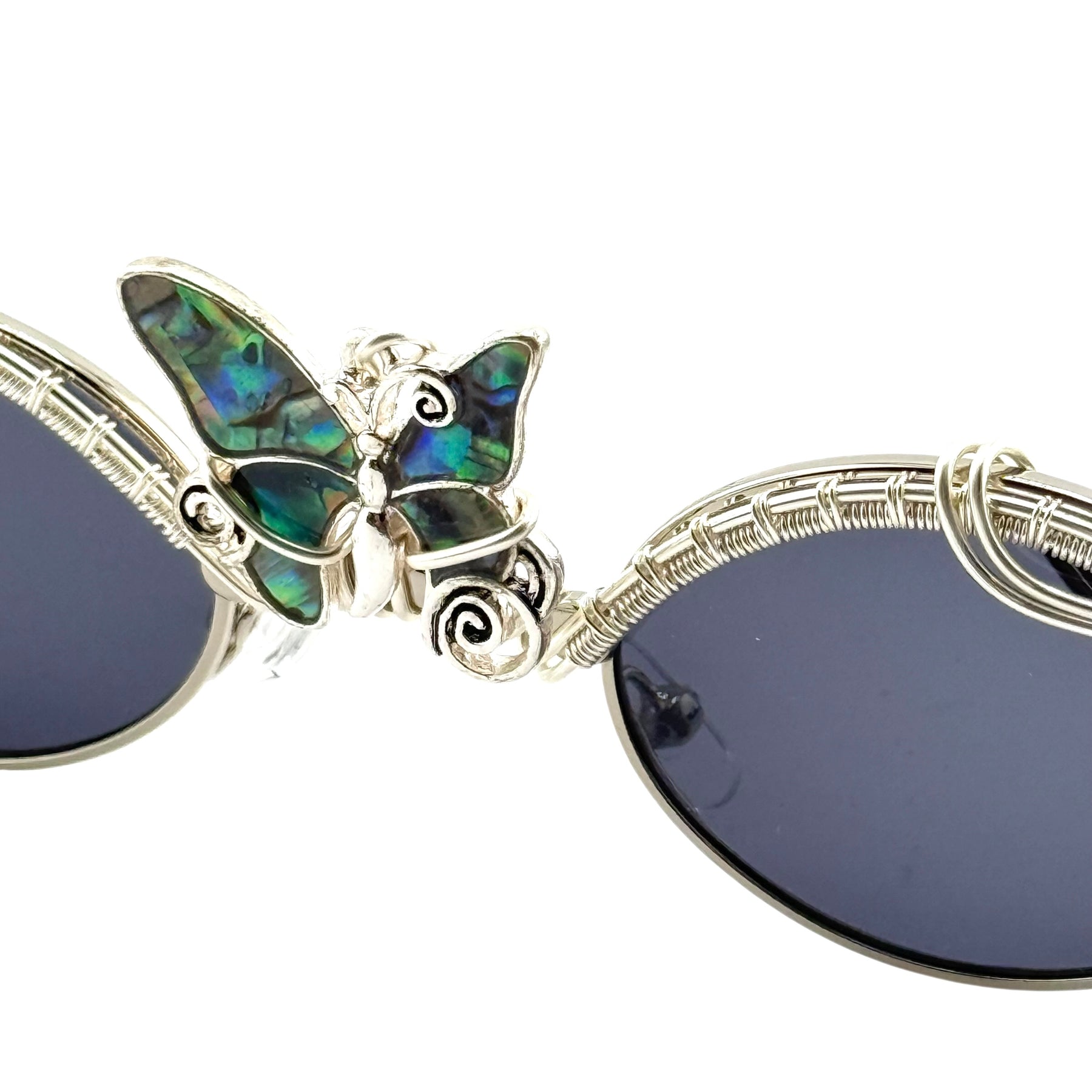 Abalone Monarch is a one-of-a-kind pair of Spunglasses, hand wire-wrapped from start to finish in our studio. Featuring deep blue lenses with silver wire wrapping and a striking abalone butterfly centerpiece that flashes green, teal, and violet in the light.