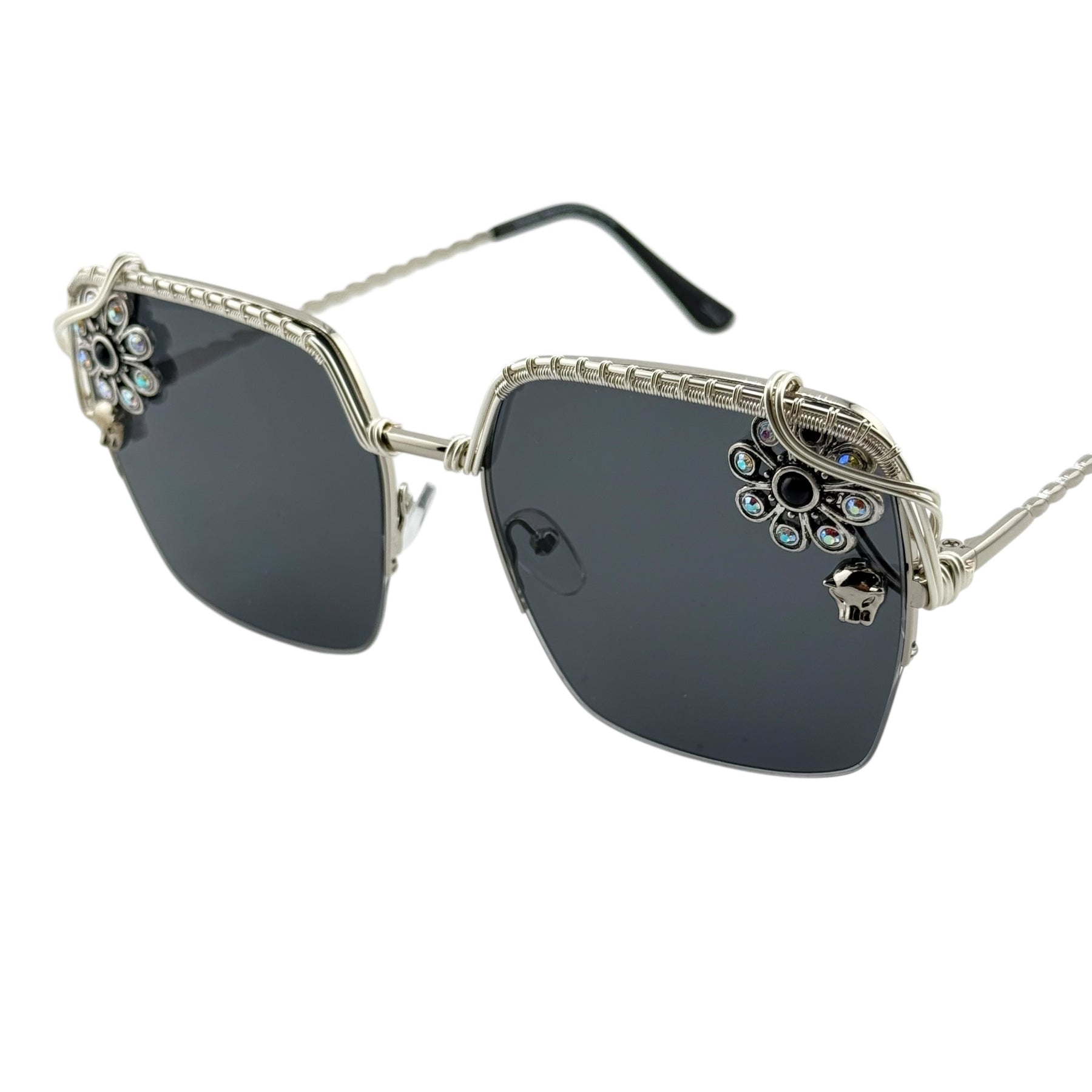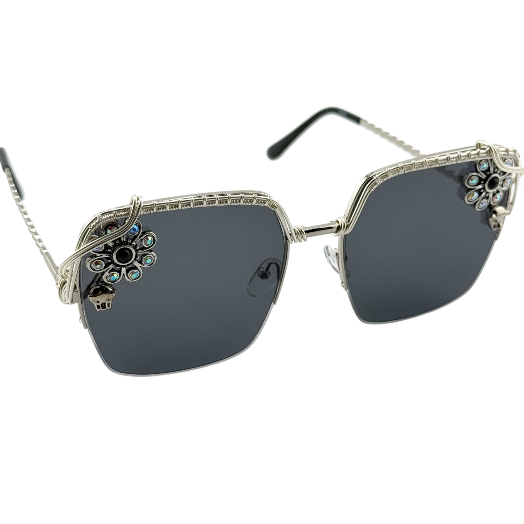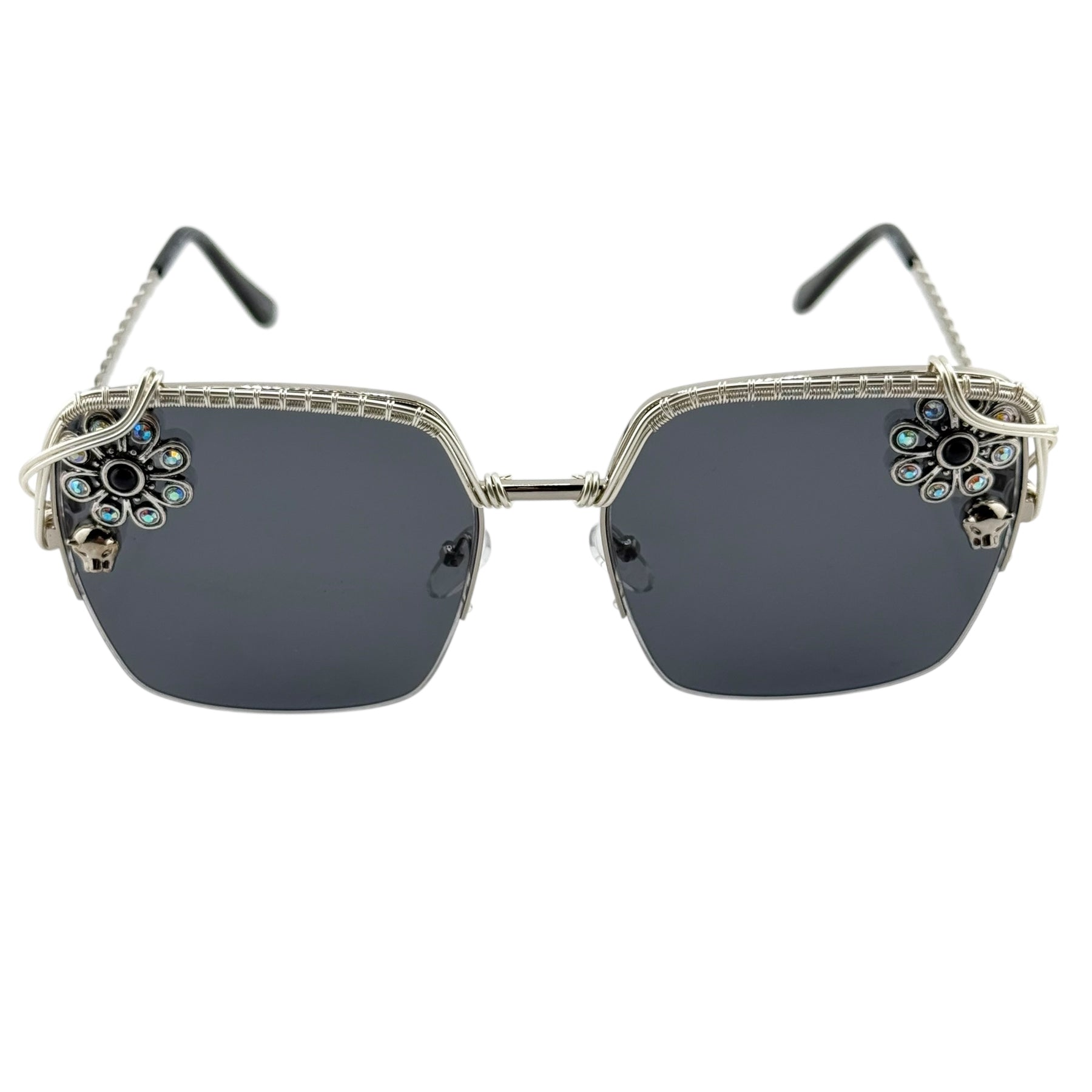 Opal Flowers is a one-of-a-kind pair of Spunglasses, hand wire-wrapped from start to finish in our studio. Featuring dark square lenses framed in silver wire with opal flower accents that catch the light with flashes of blue and green.
